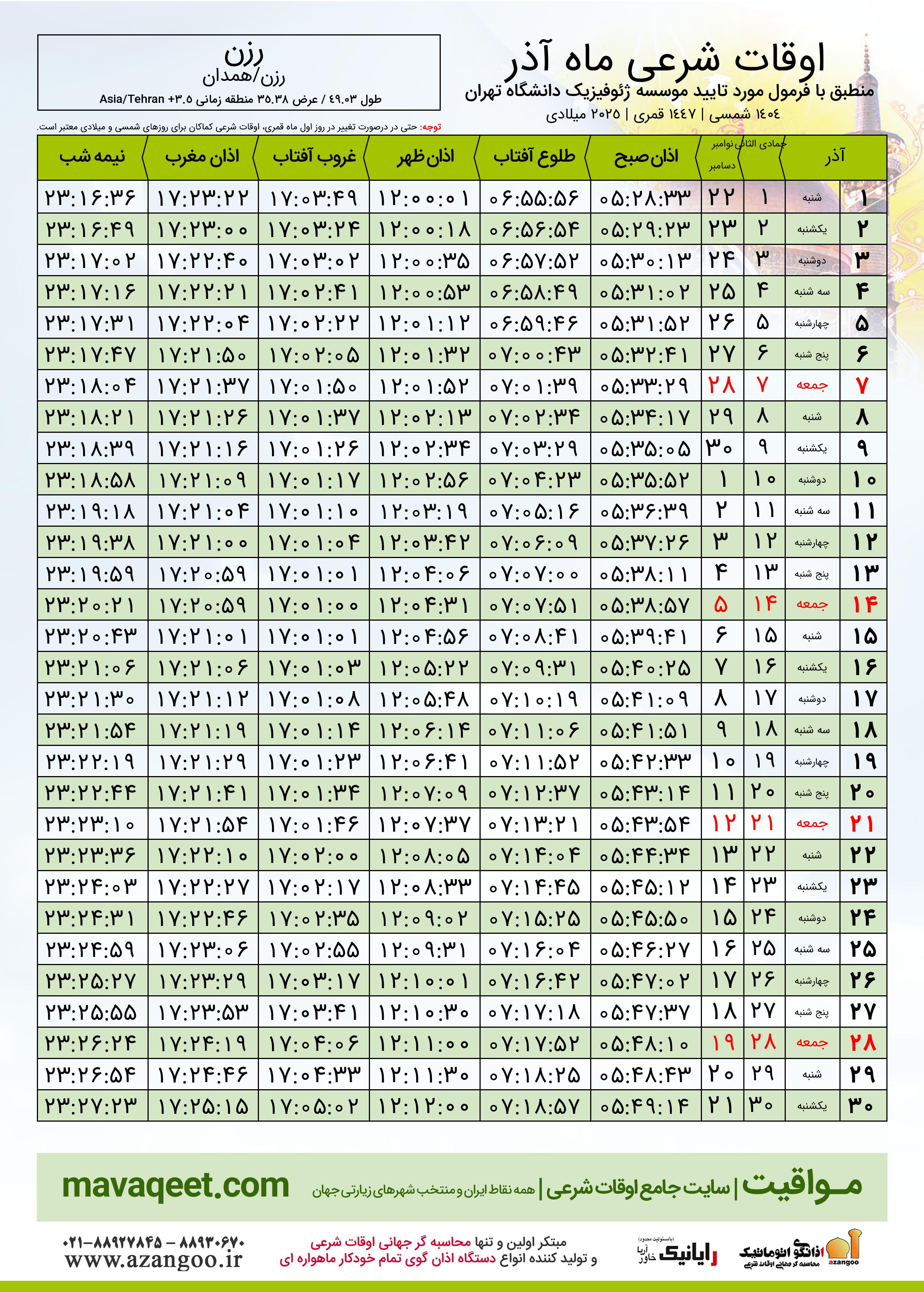 جدول اوقات شرعی آذر ١٤٠٤ شمسی شهر رزن