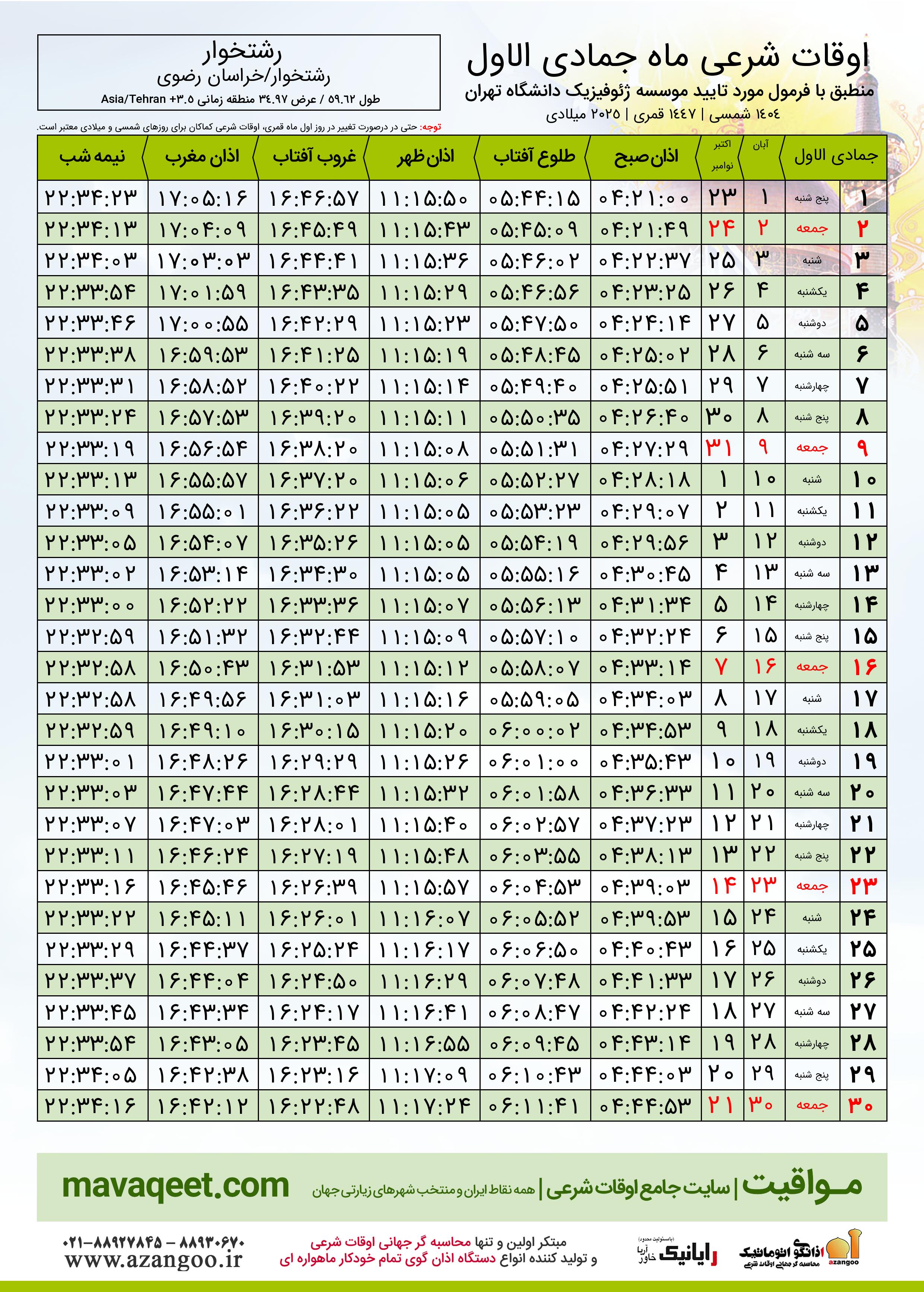 اوقات شرعی ماه جمادی الاول ١٤٤٧ هـ.ق شهر رشتخوار بر
