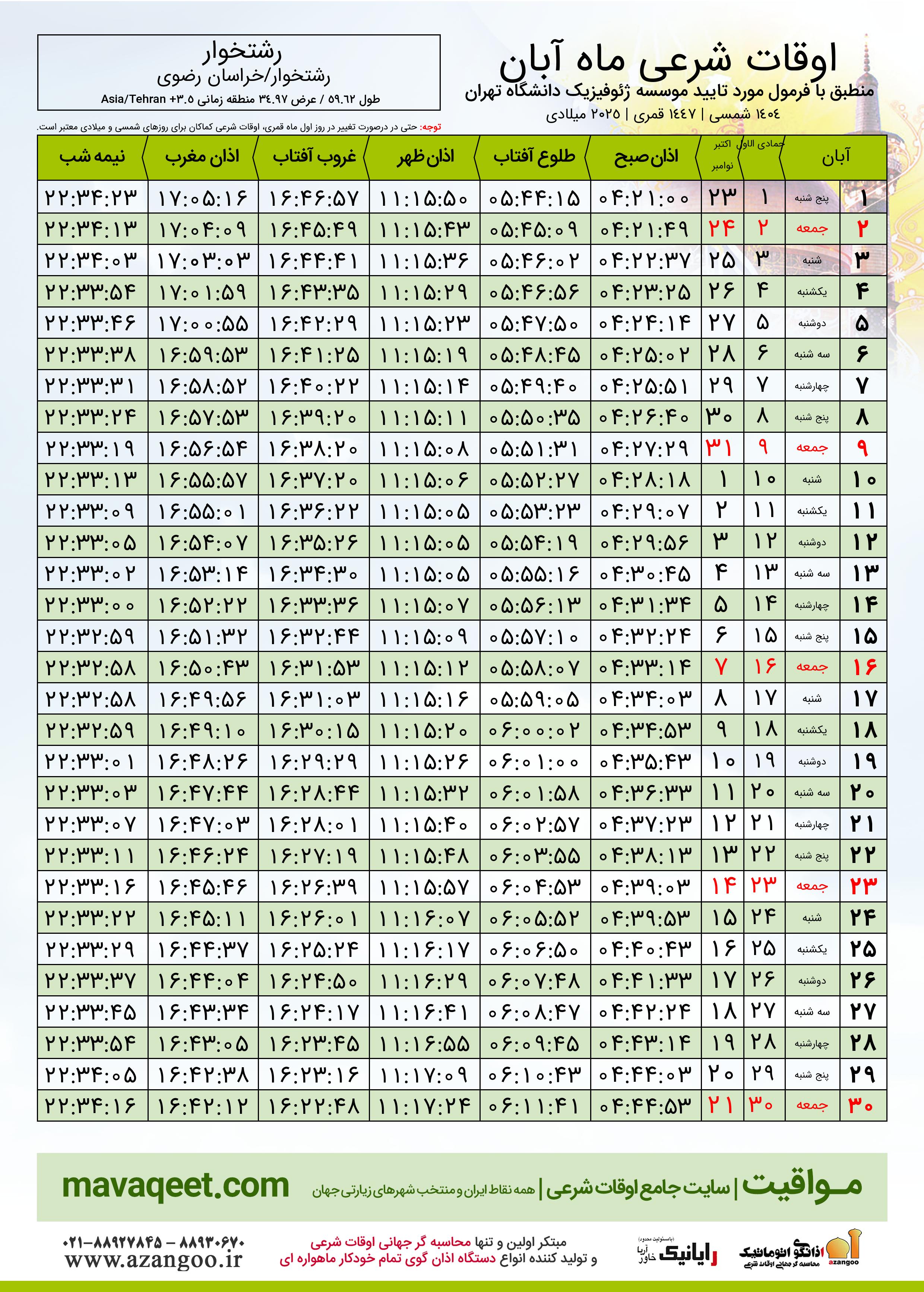 جدول اوقات شرعی آبان ١٤٠٤ شمسی شهر رشتخوار