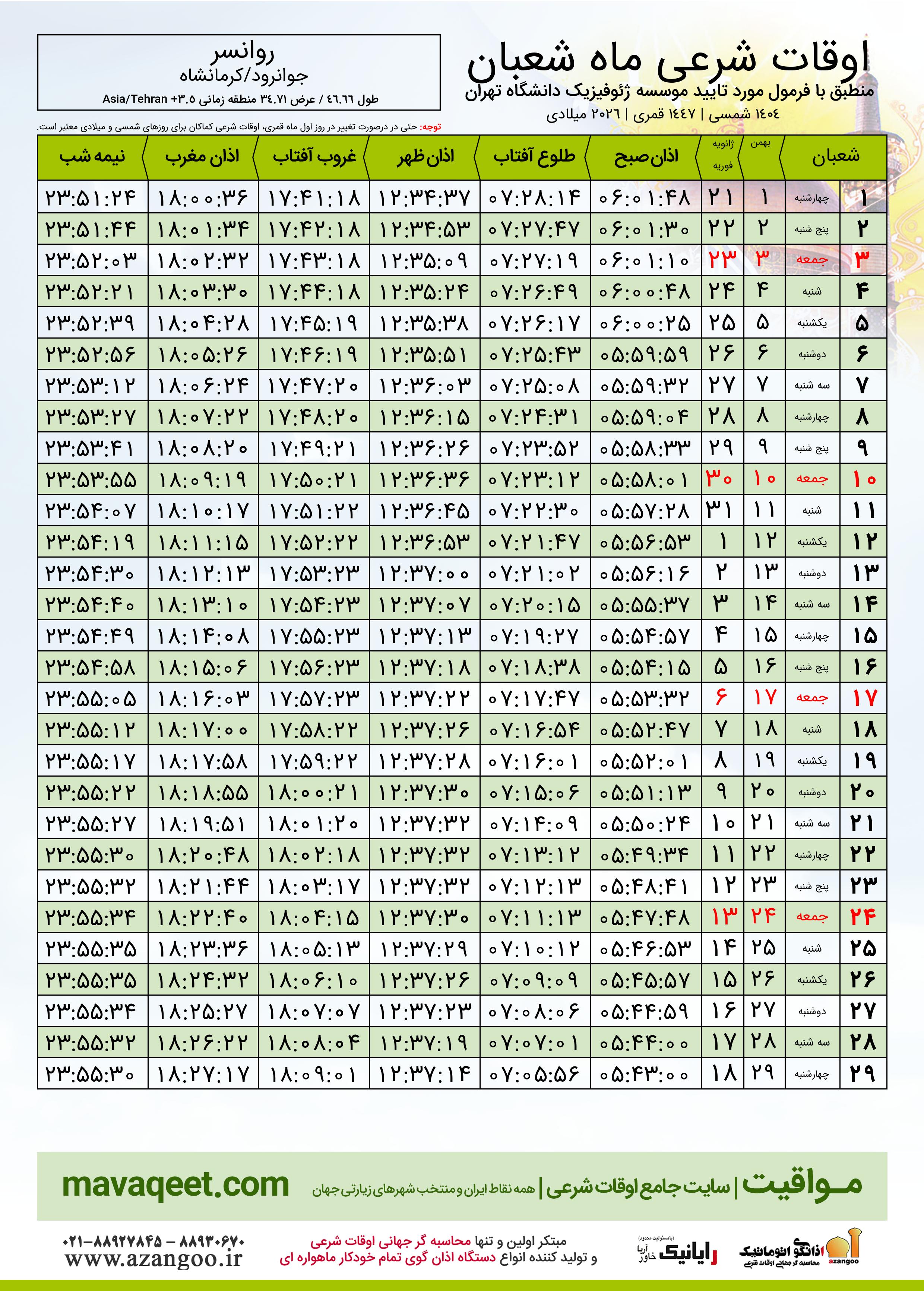 اوقات شرعی ماه شعبان ١٤٤٧ هـ.ق شهر روانسر بر