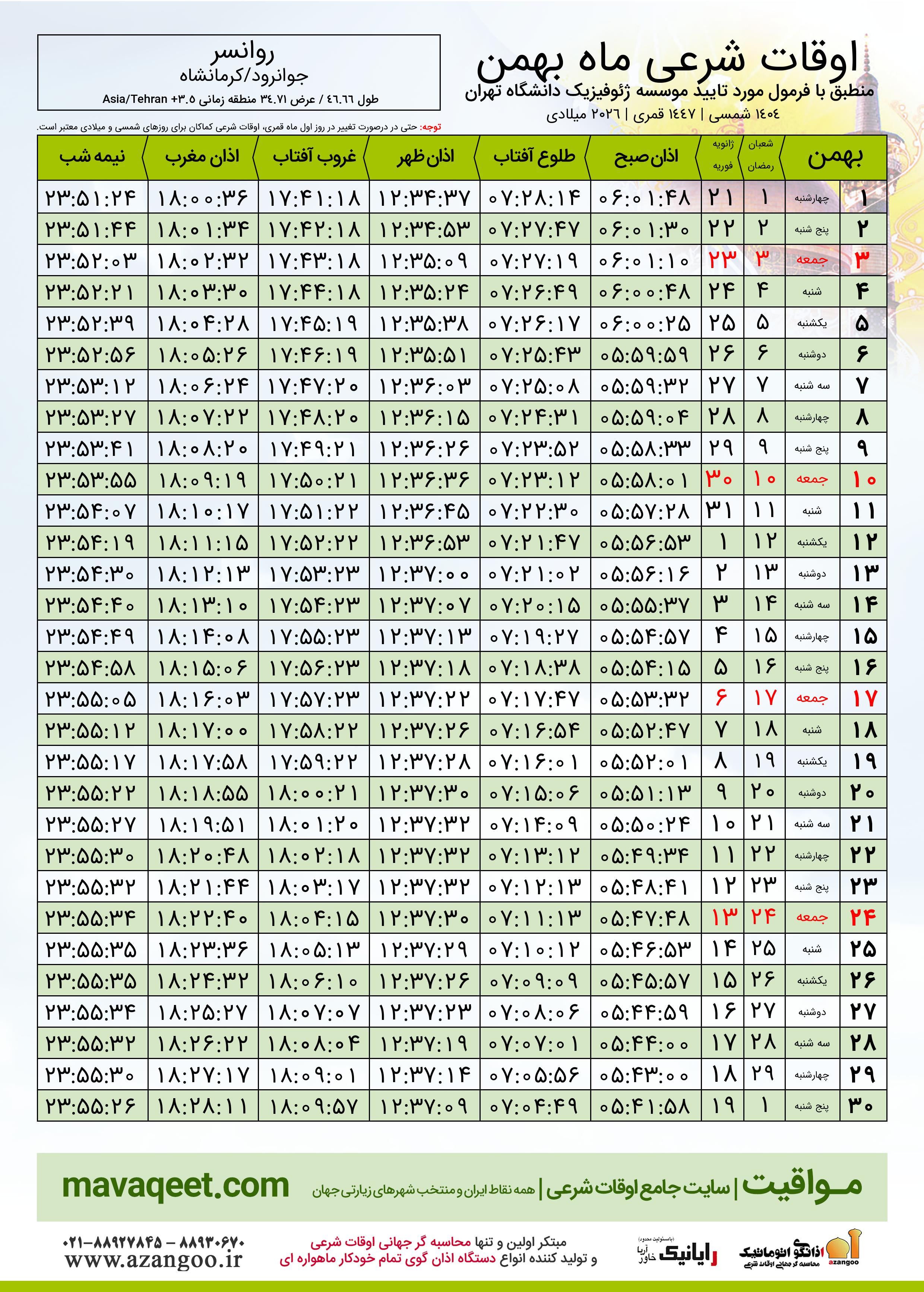 دانلود اوقات شرعی بهمن ٠٤ - ١٤٠٤ شهر روانسر