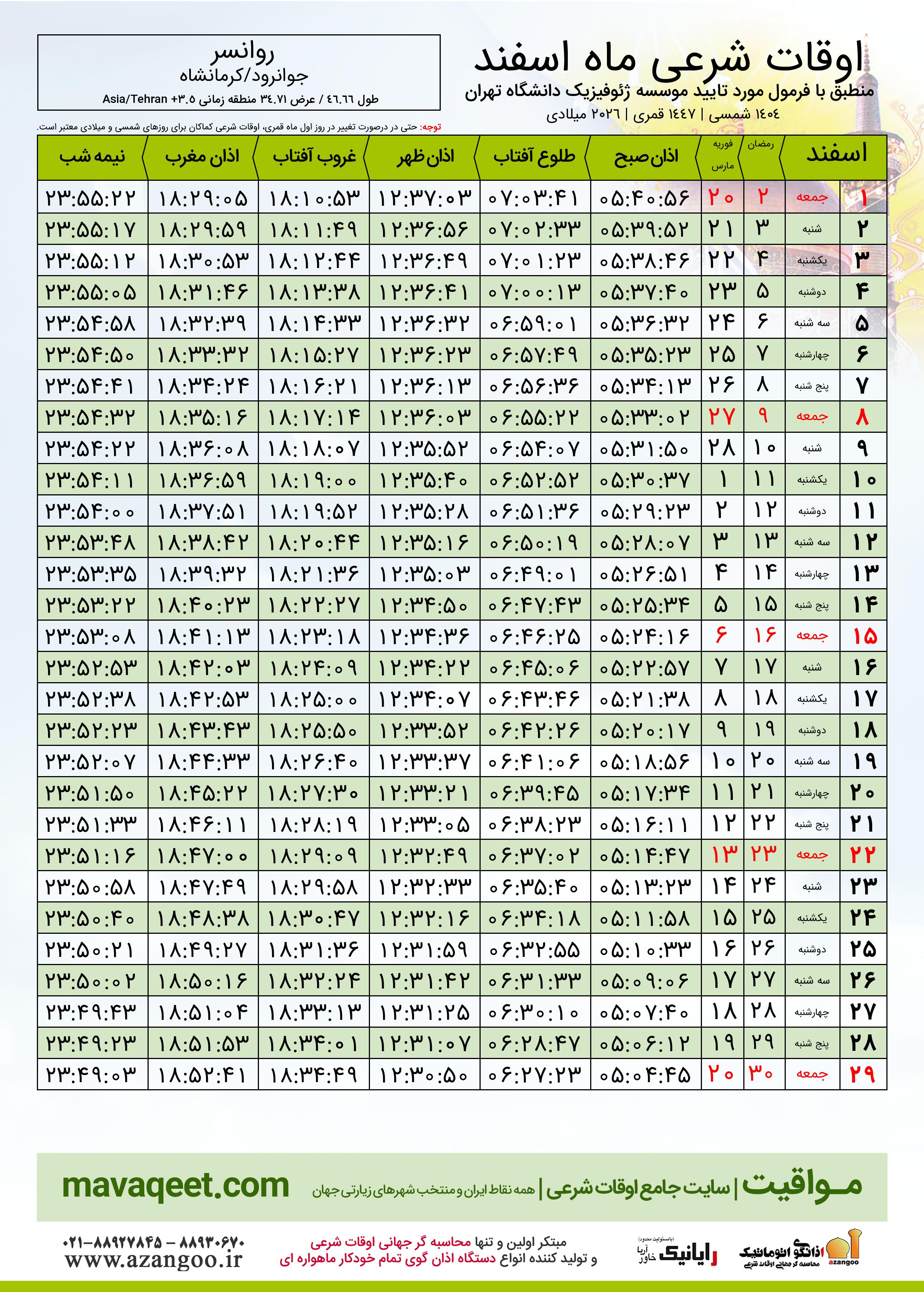 اوقات شرعی ماه رمضان شهر روانسر ١٤٠٤ - ٠٤ شمسی | ٢٠٢٦ میلادی