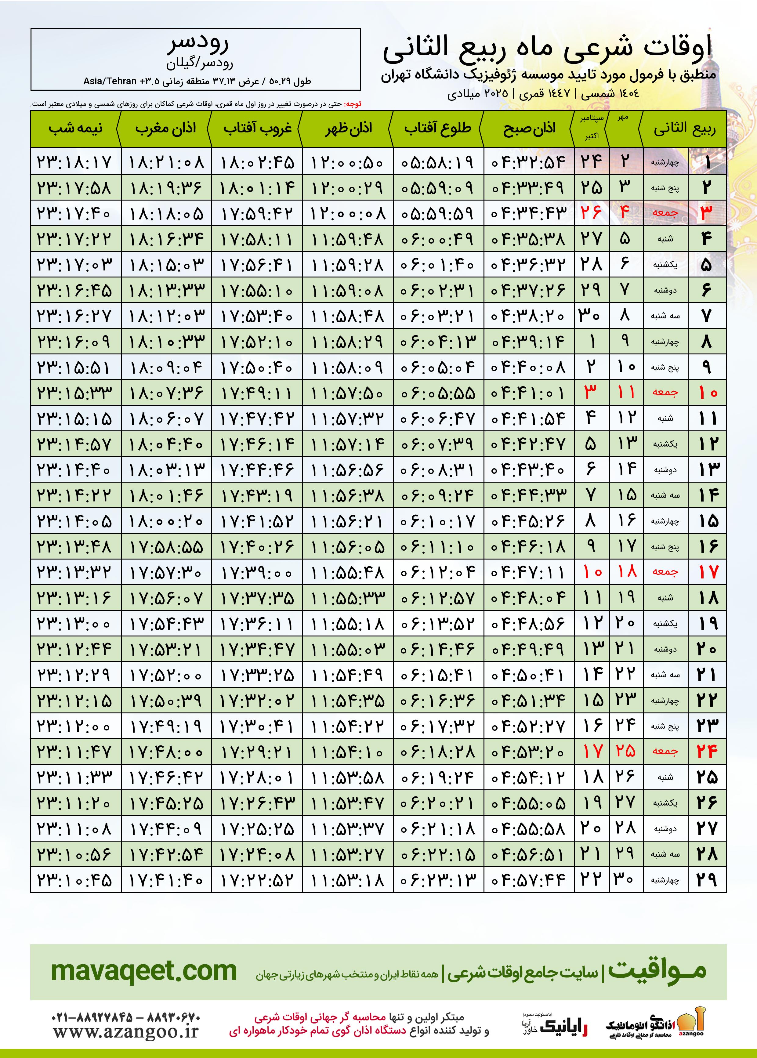 جدول اوقات شرعی ربیع الثانی ١٤٤٧ قمری شهر رودسر