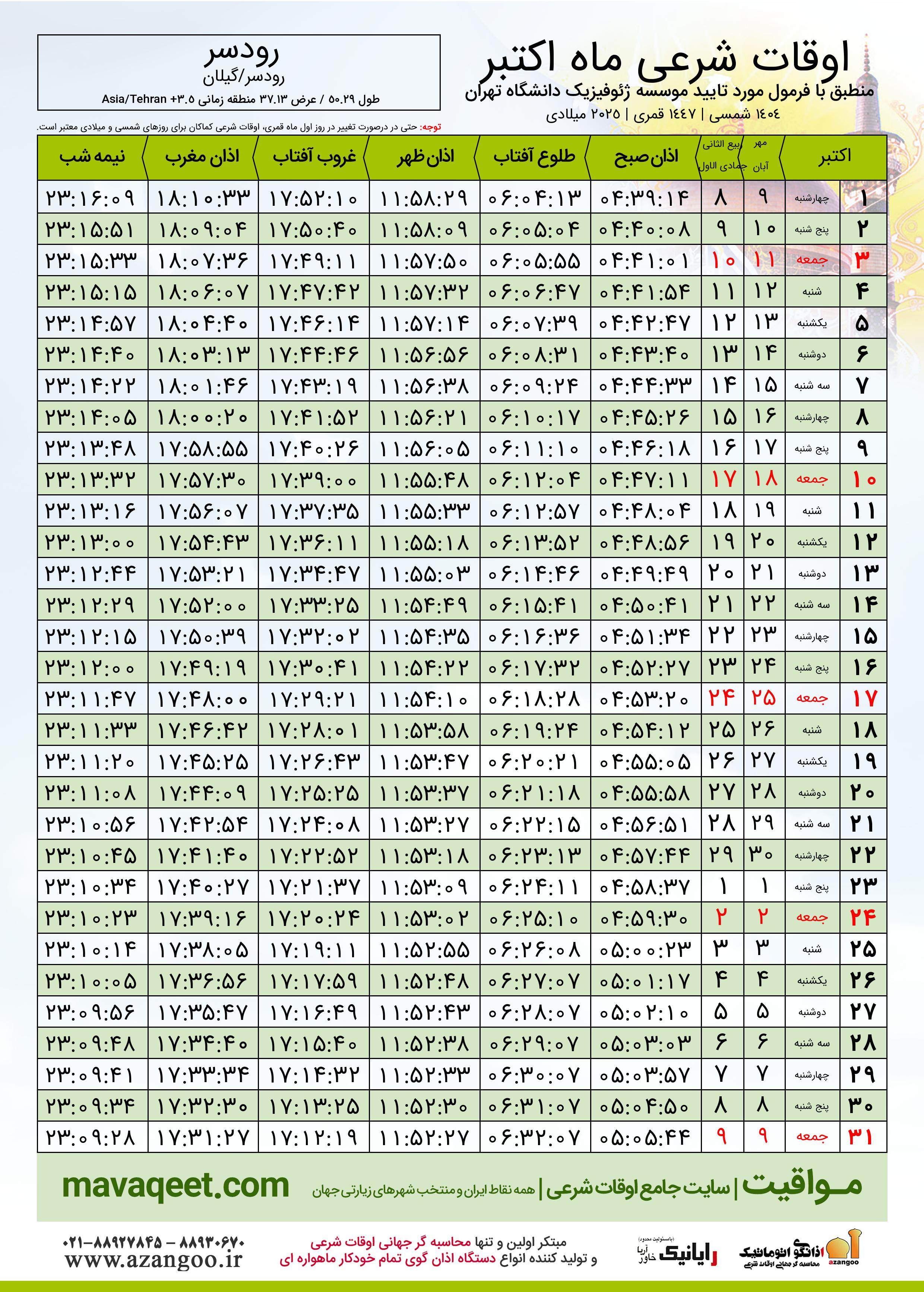 اوقات شرعی اکتبر ٢٠٢٥ میلادی شهر رودسر