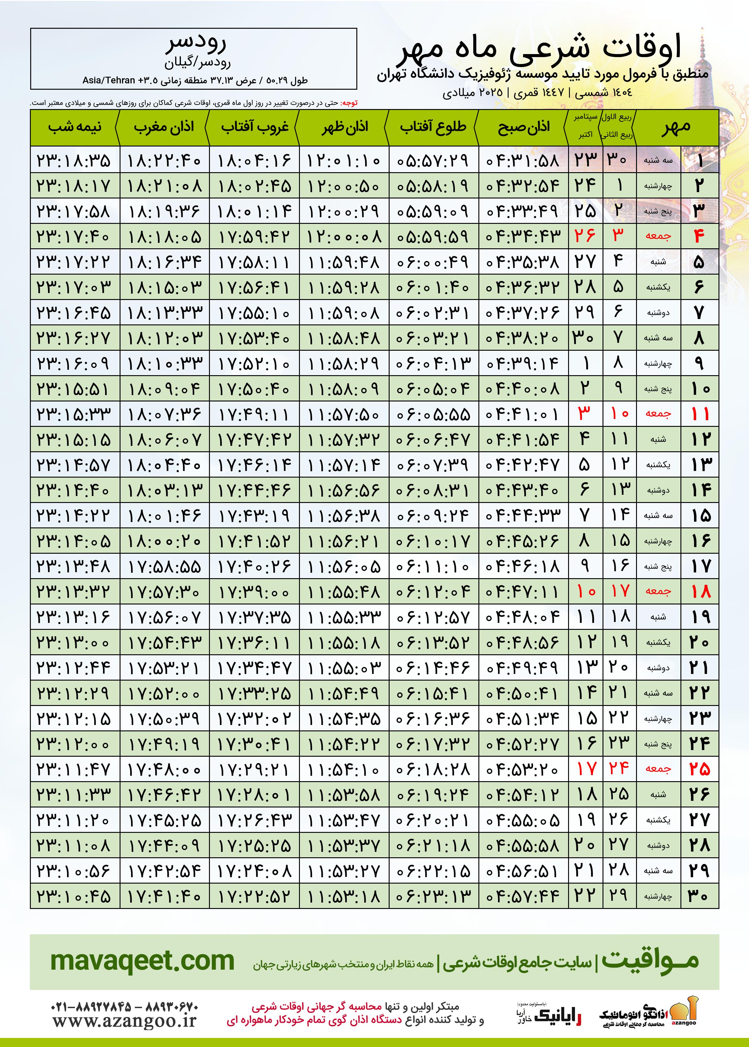 جدول اوقات شرعی مهر ١٤٠٤ شمسی شهر رودسر