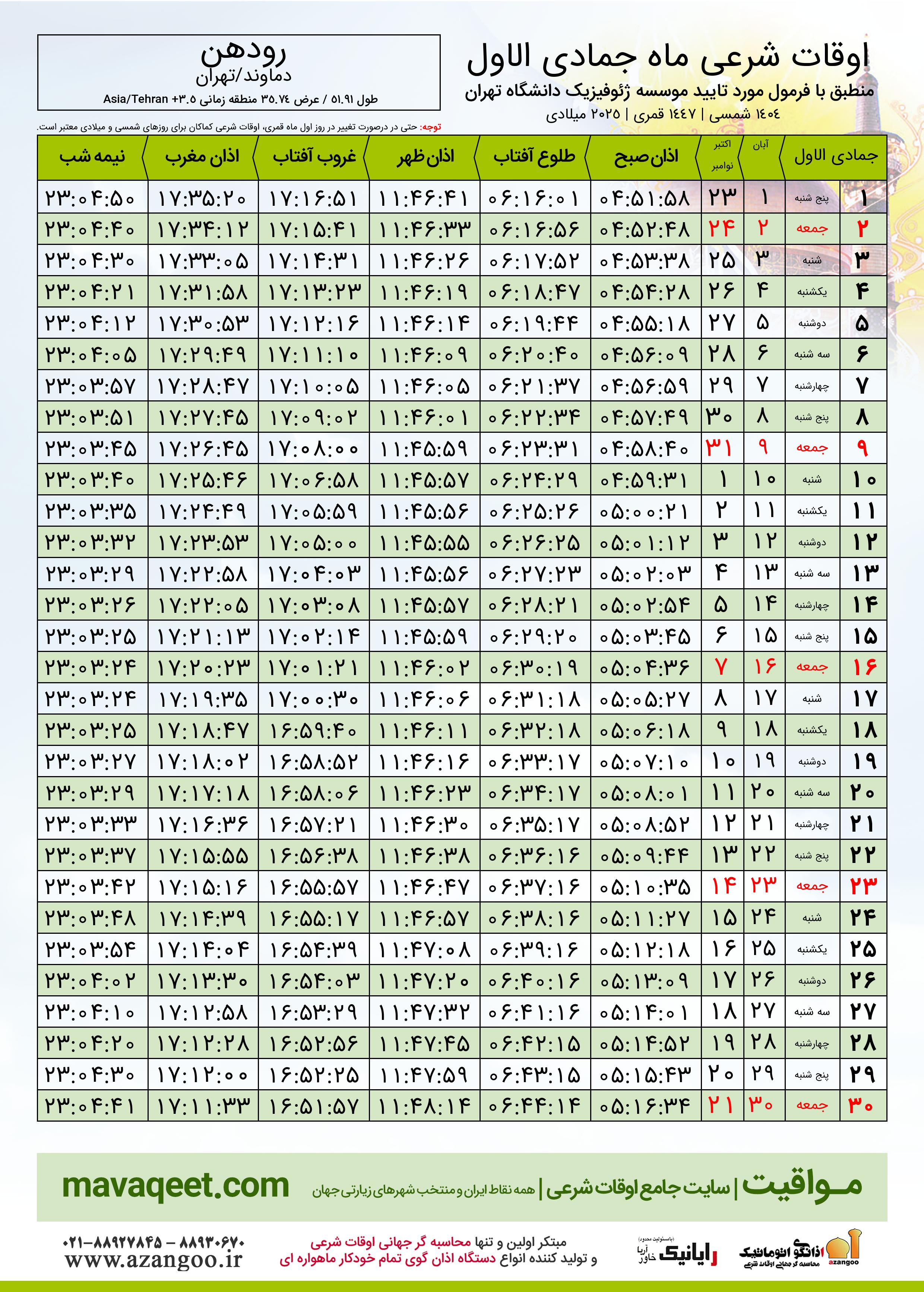 اوقات شرعی ماه جمادی الاول ١٤٤٧ هـ.ق شهر رودهن بر
