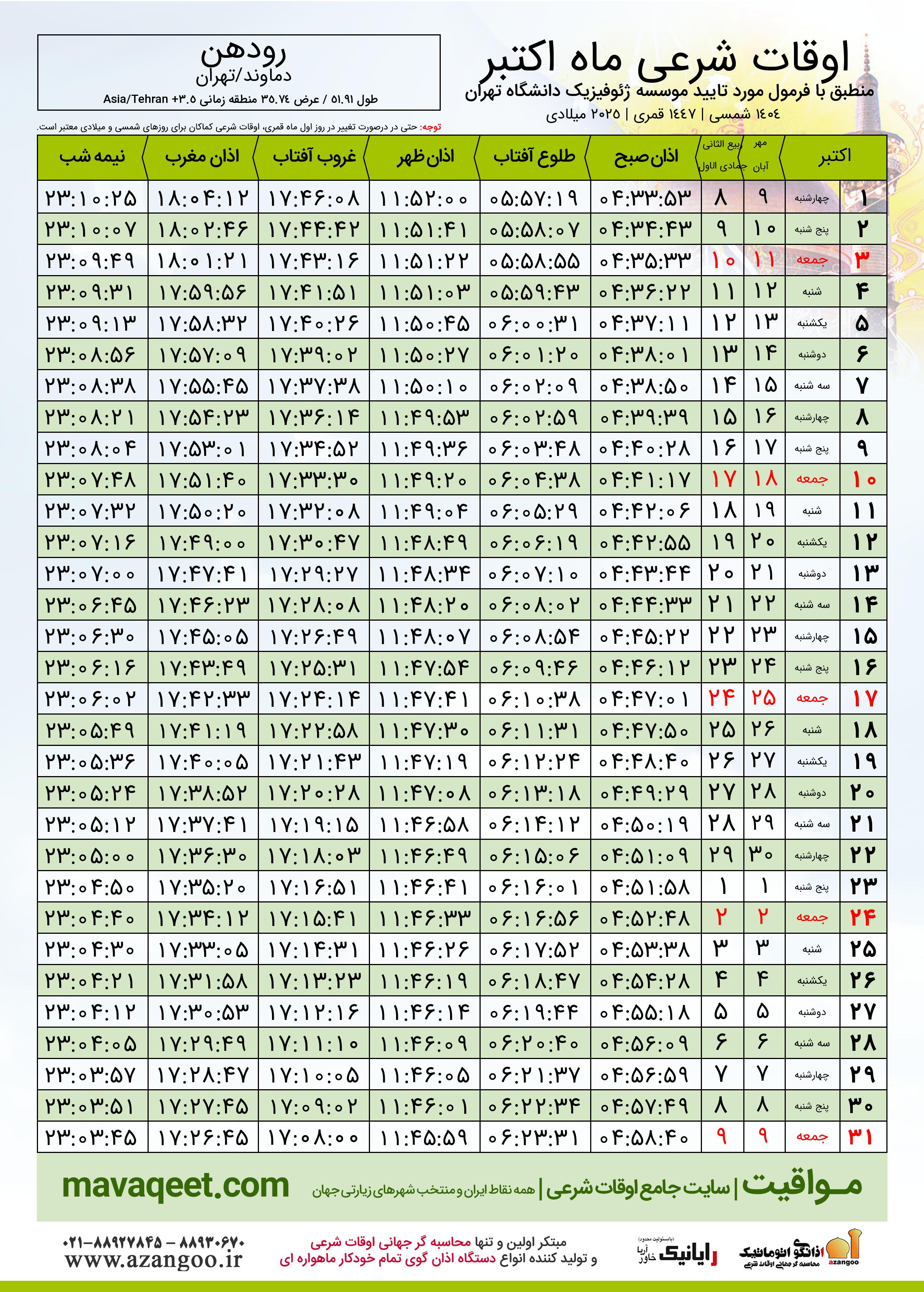 جهت نمایش تصویر جدول اوقات شرعی جدول اوقات شرعی اکتبر ٢٠٢٥ میلادی شهر رودهن شهر رودهن در اندازه