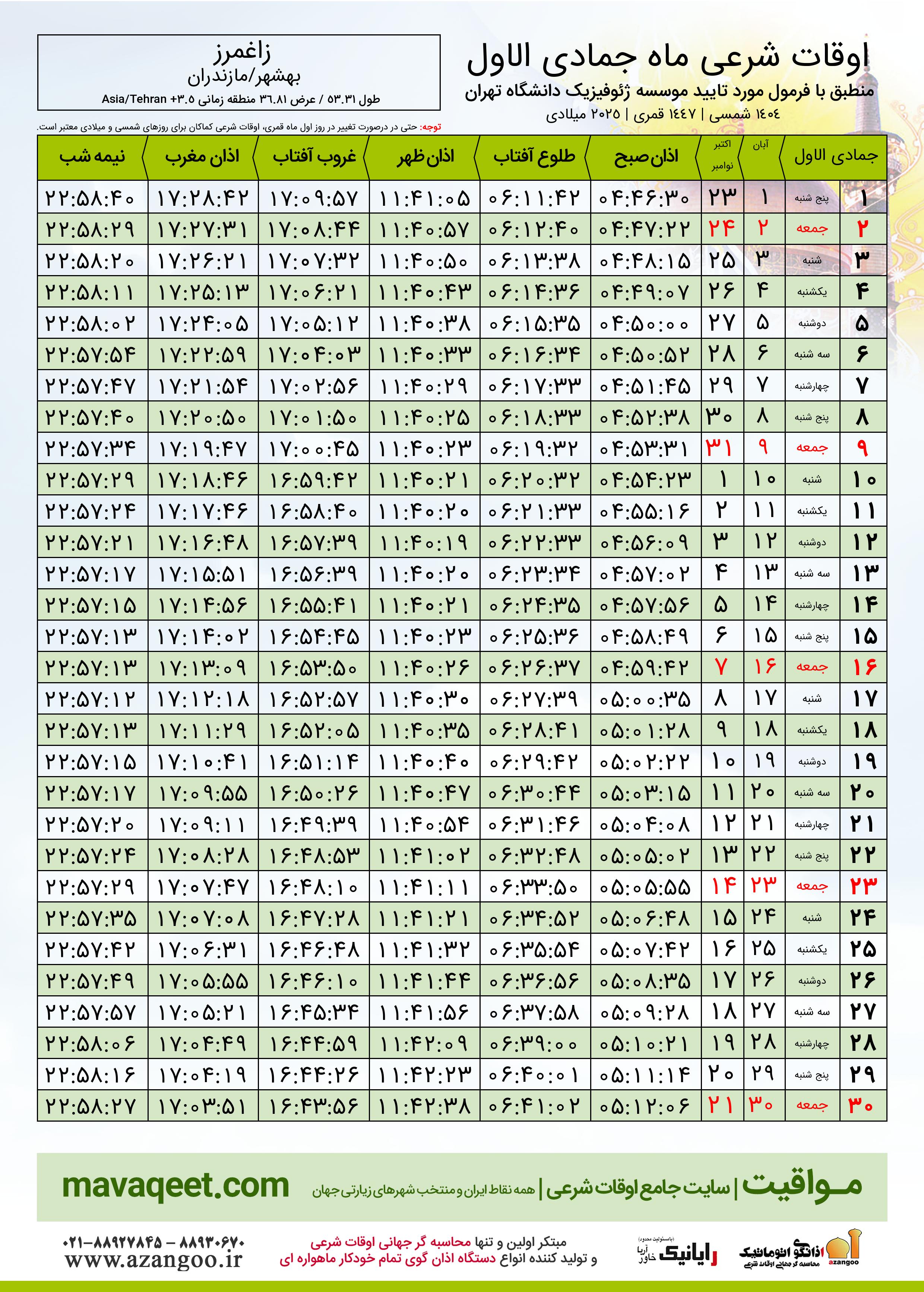 جدول اوقات شرعی جمادی الاول ١٤٤٧ قمری شهر زاغمرز