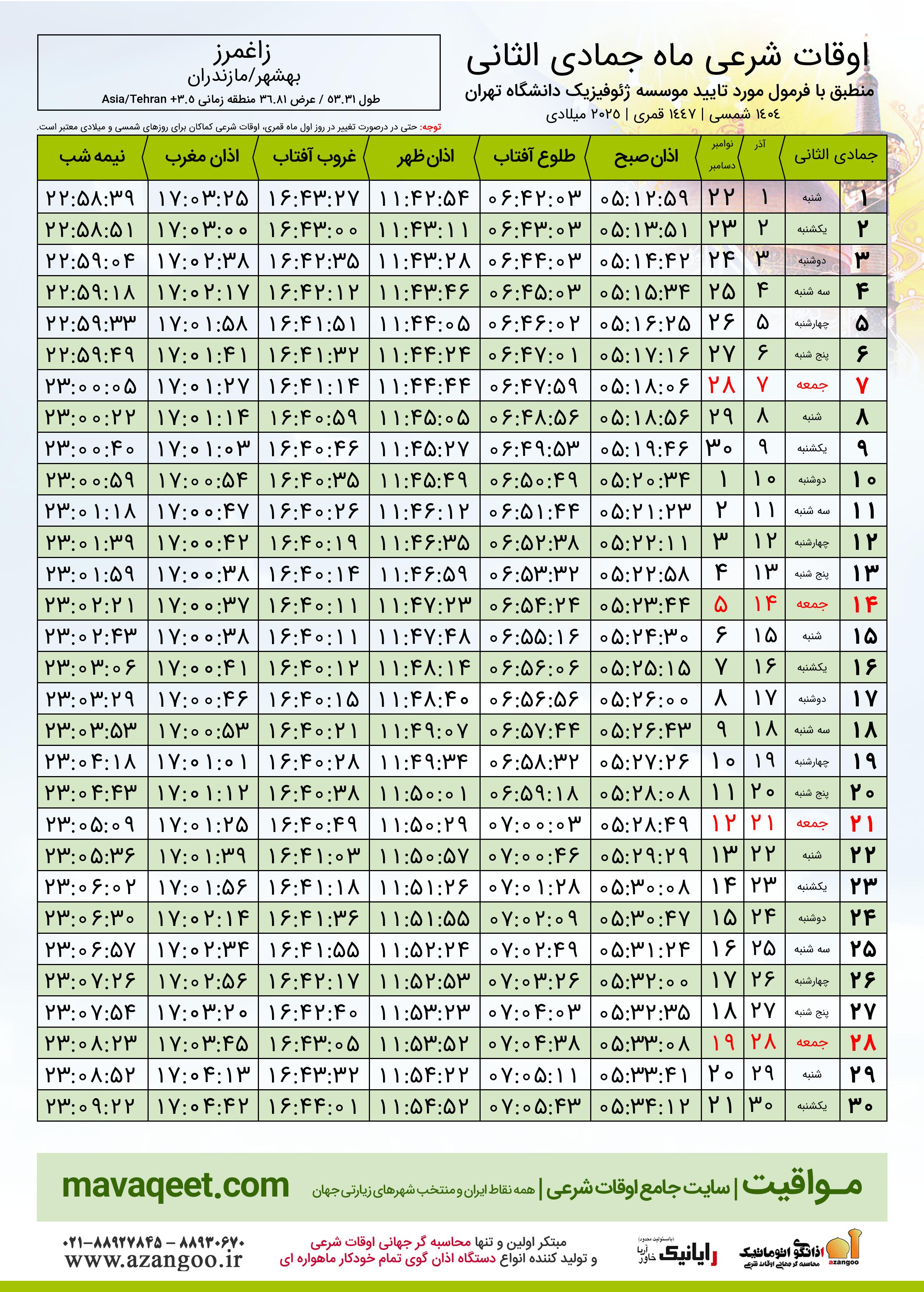 اوقات شرعی ماه جمادی الثانی ١٤٤٧ هـ.ق شهر زاغمرز بر