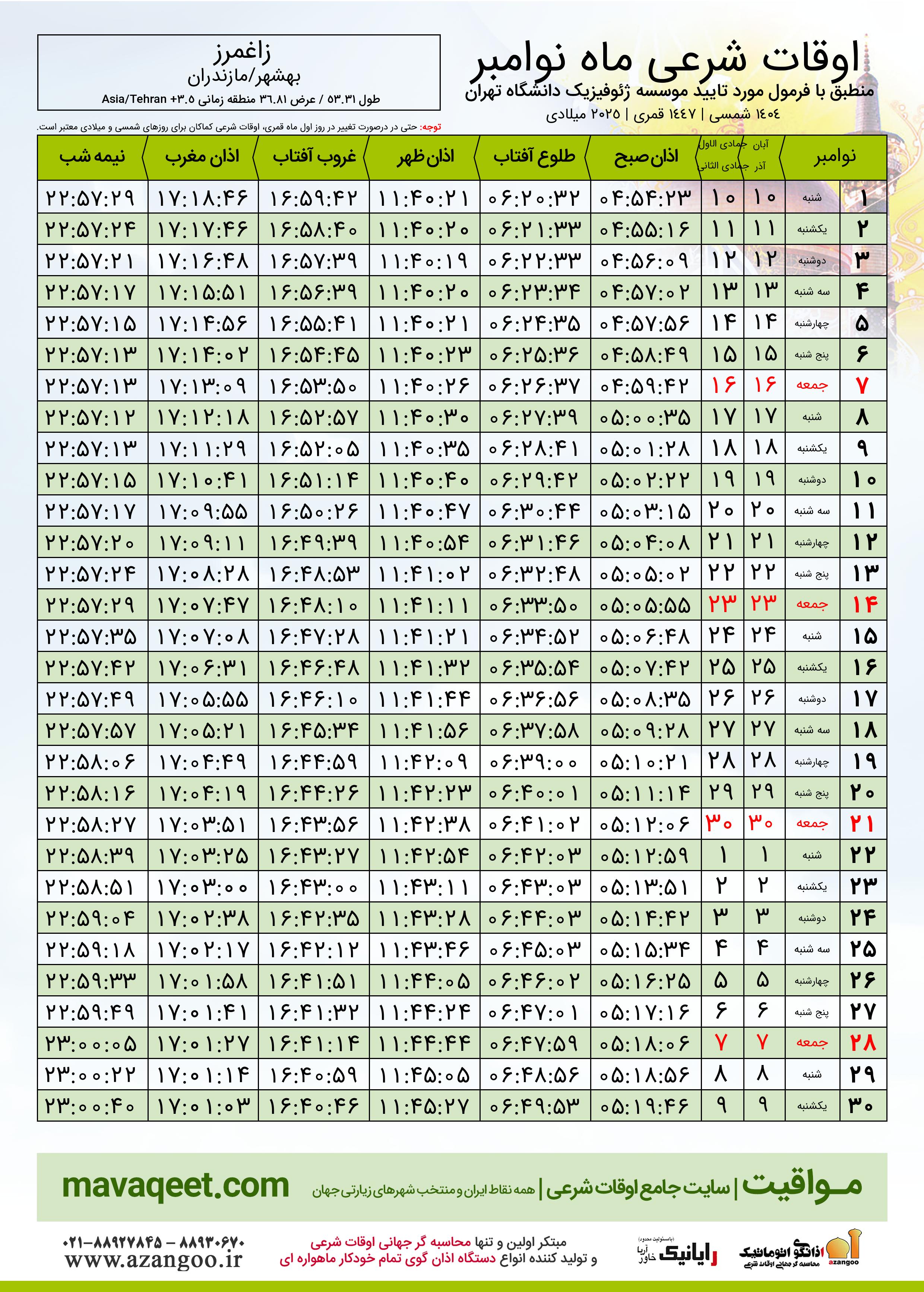 جدول اوقات شرعی نوامبر ٢٠٢٥ میلادی شهر زاغمرز