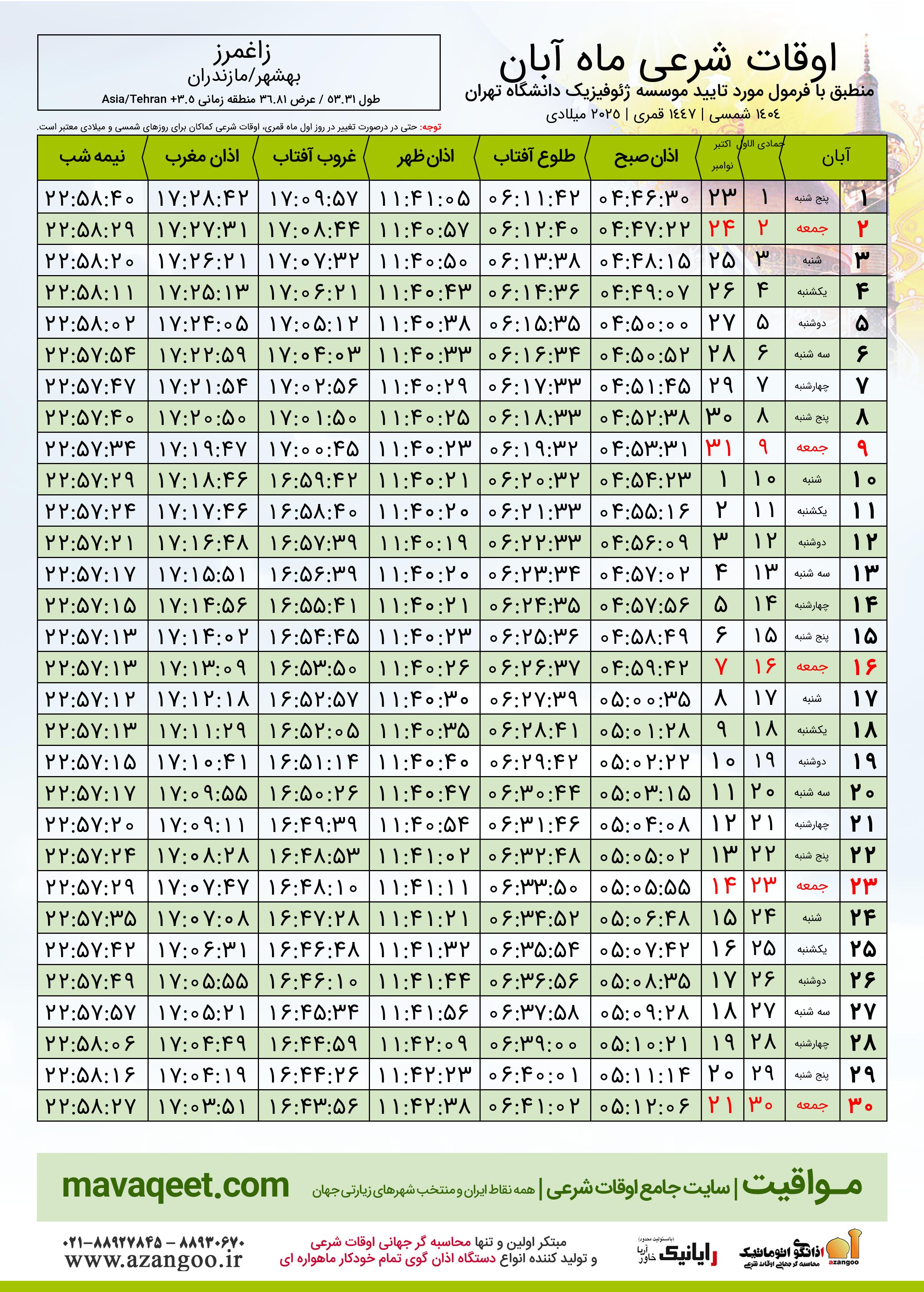 جدول اوقات شرعی آبان ١٤٠٤ شمسی شهر زاغمرز