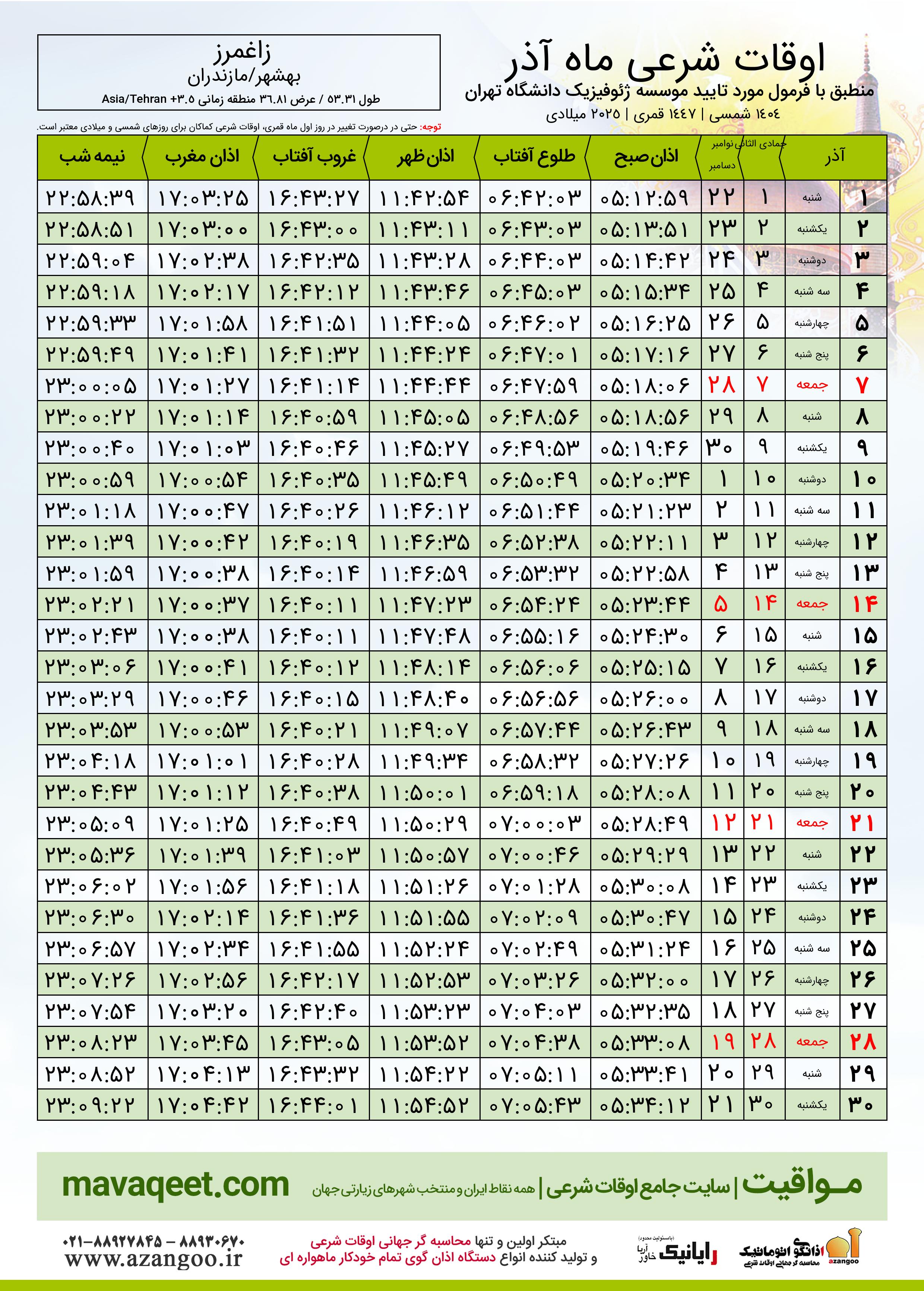 اوقات شرعی آذر ١٤٠٤ شمسی شهر زاغمرز
