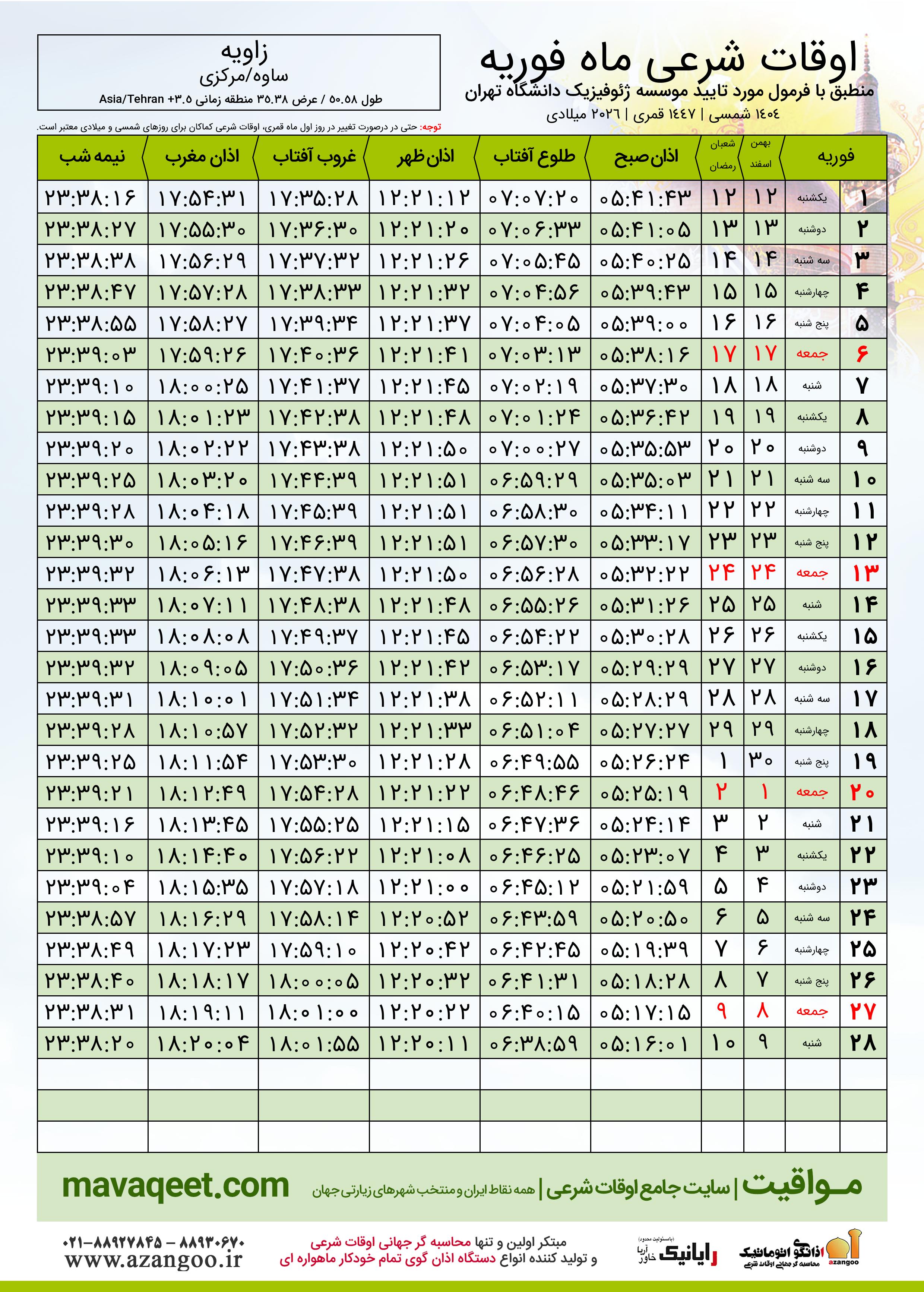 جدول اوقات شرعی فوریه ٢٠٢٦ میلادی شهر زاویه