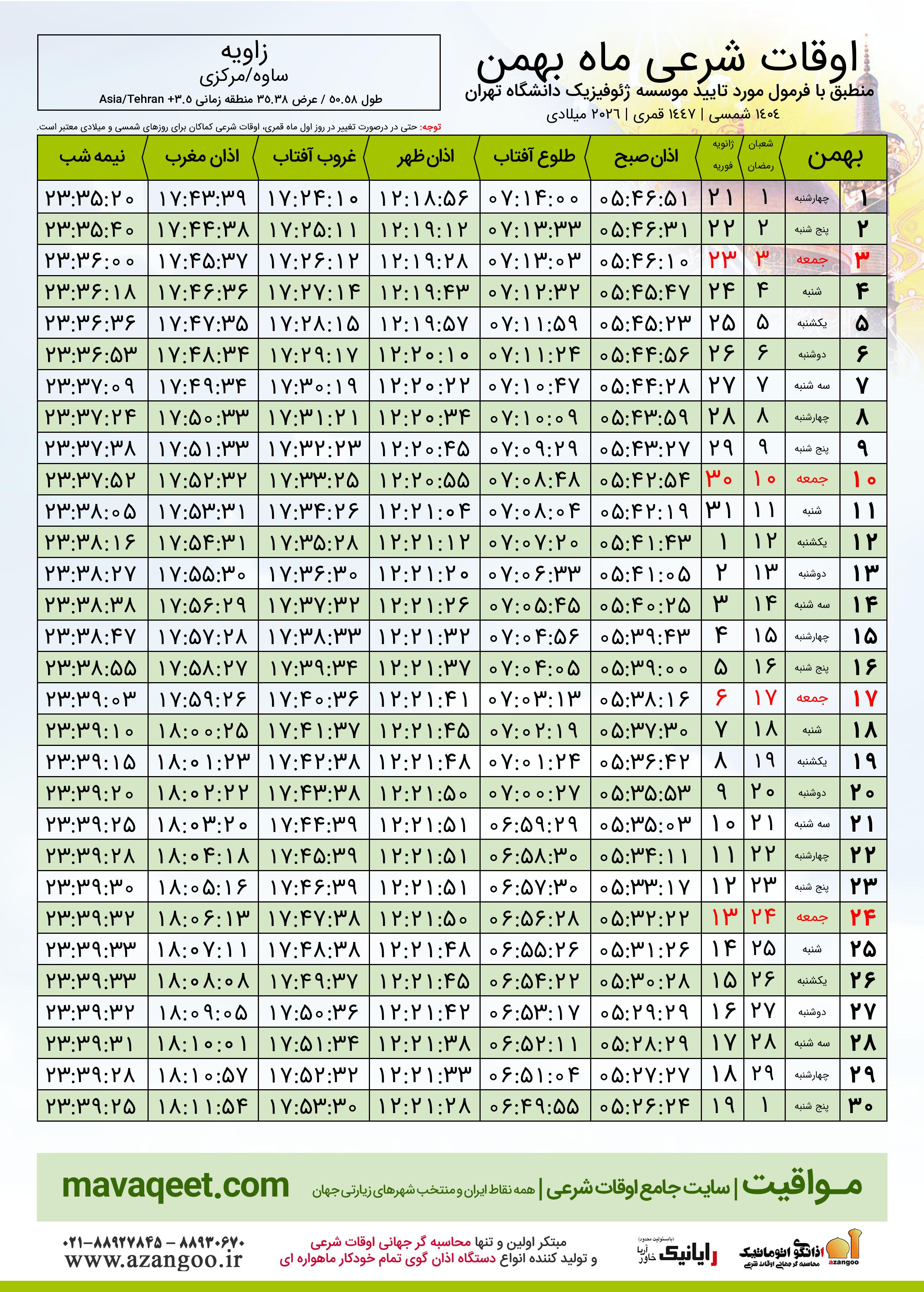 جدول اوقات شرعی بهمن ١٤٠٤ شمسی شهر زاویه