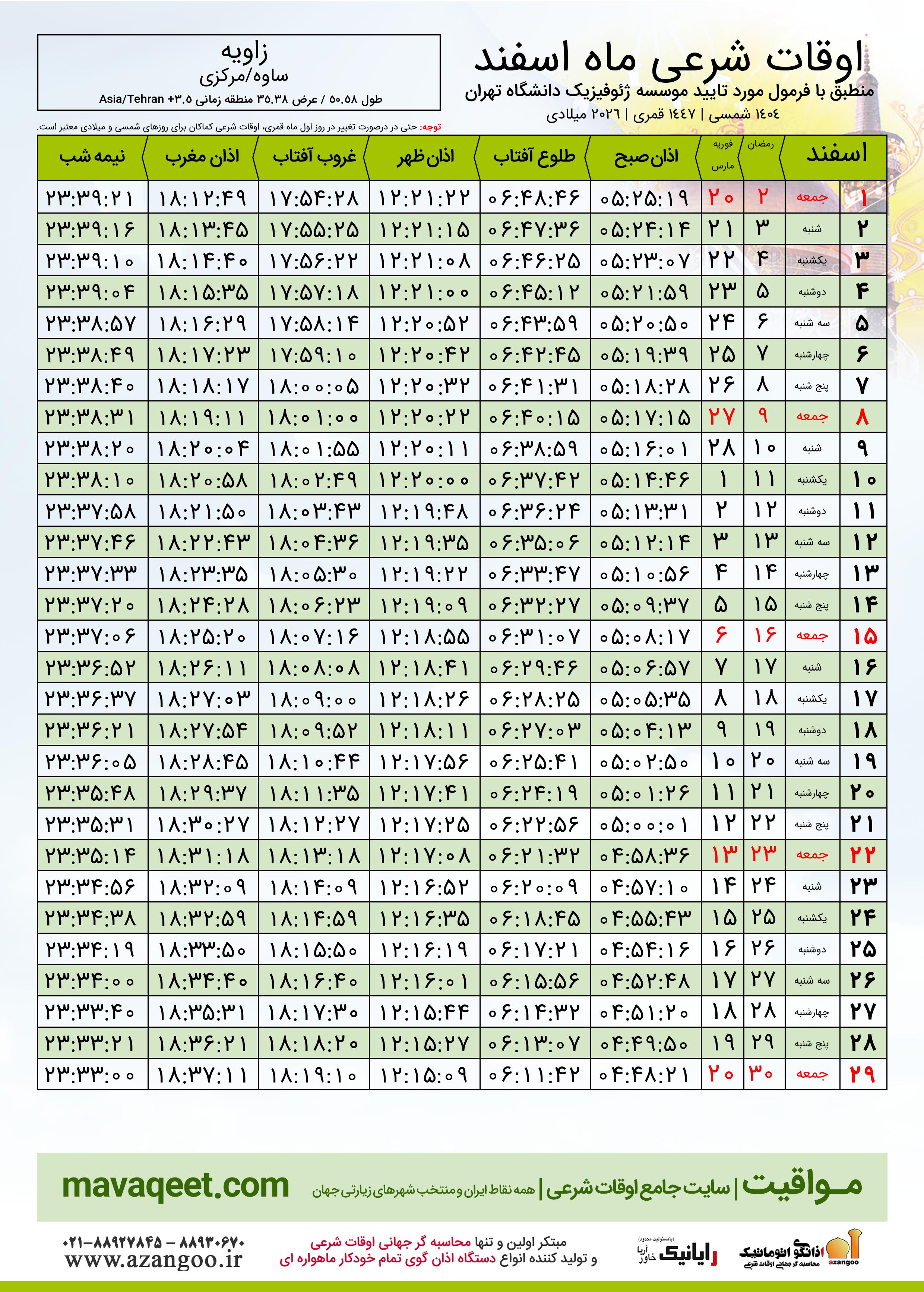 دانلود اوقات شرعی ماه رمضان ٠٤ - ١٤٠٤ شمسی | ٢٠٢٦ میلادی | ١٤٤٧ قمری شهر زاویه