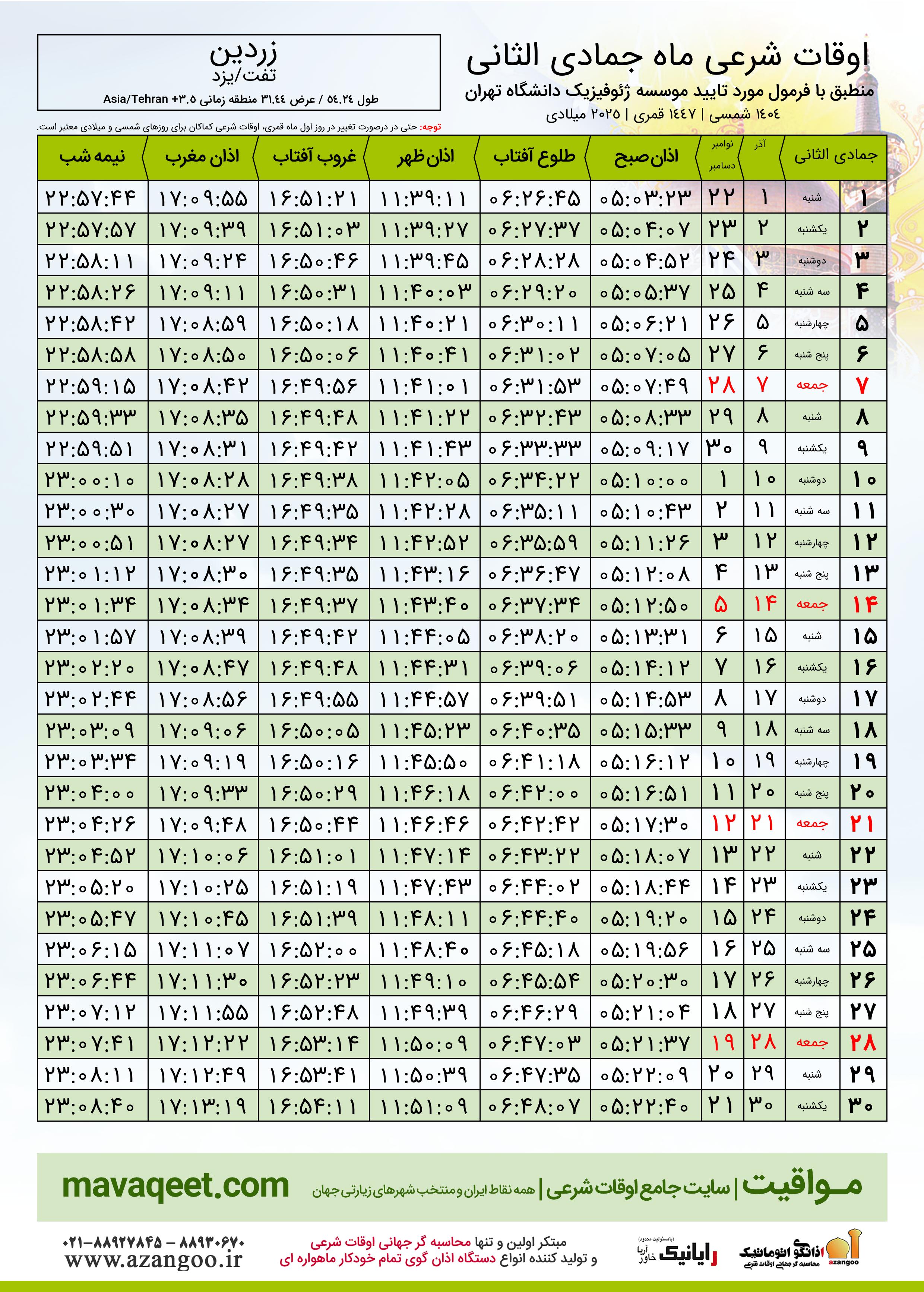 جدول اوقات شرعی جمادی الثانی ١٤٤٧ قمری شهر زردین