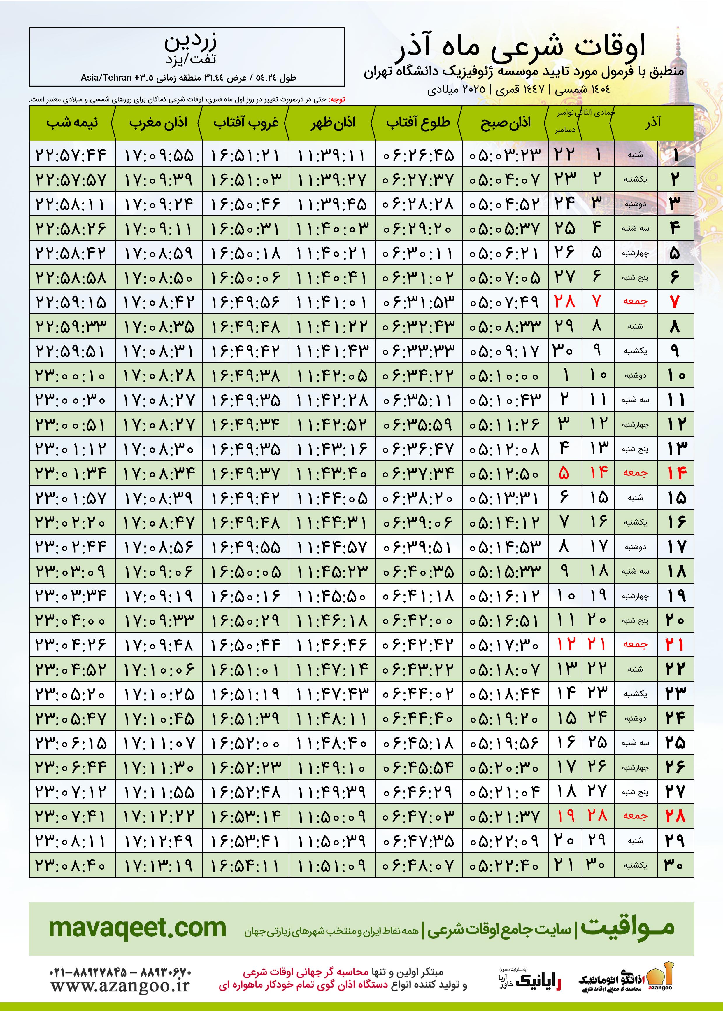 دانلود اوقات شرعی آذر ٠٤ - ١٤٠٤ شهر زردین
