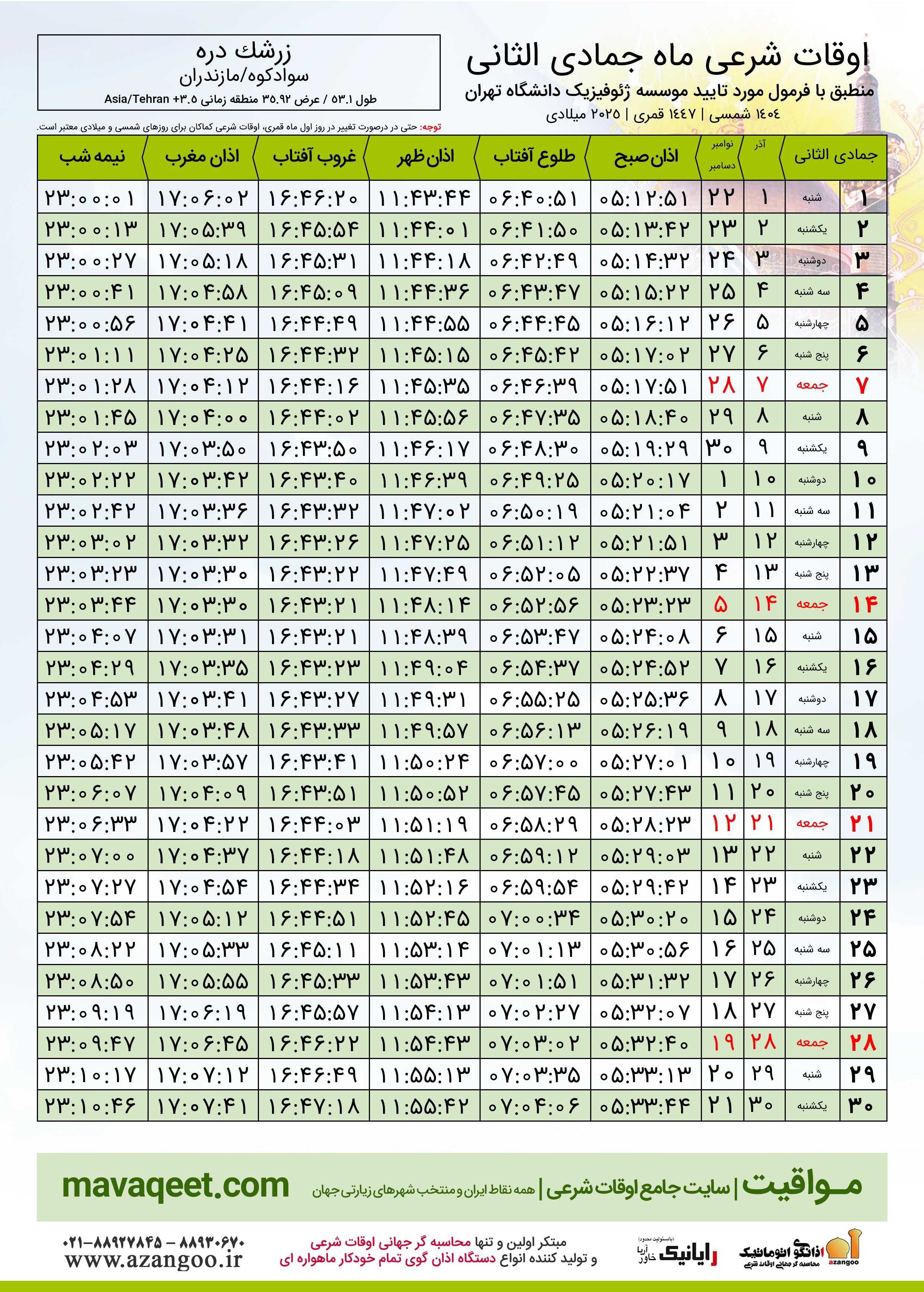 اوقات شرعی ماه جمادی الثانی ١٤٤٧ هـ.ق شهر زرشک دره بر