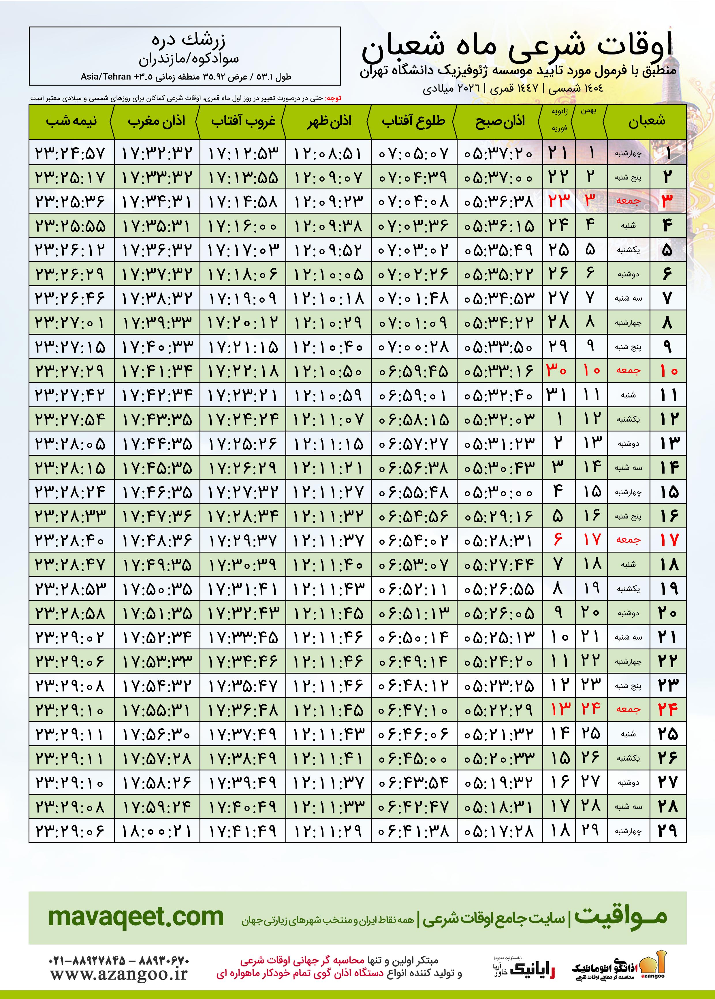 اوقات شرعی ماه شعبان ١٤٤٧ هـ.ق شهر زرشک دره بر