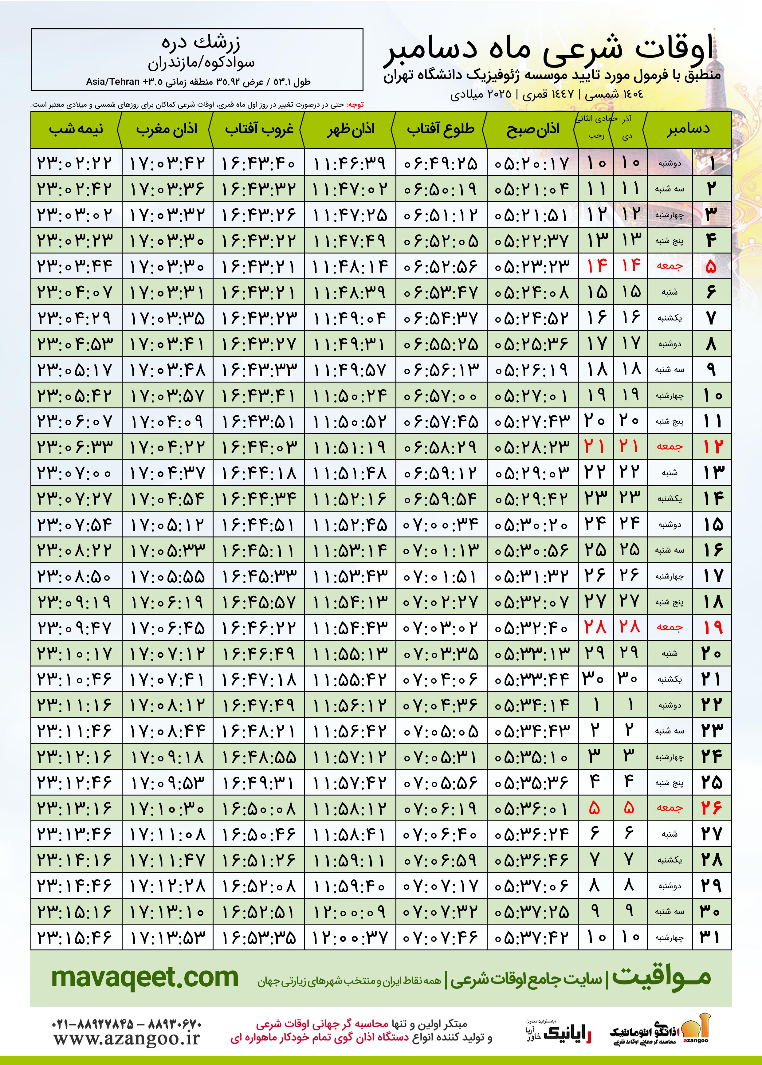 جدول اوقات شرعی دسامبر ٢٠٢٥ میلادی شهر زرشک دره