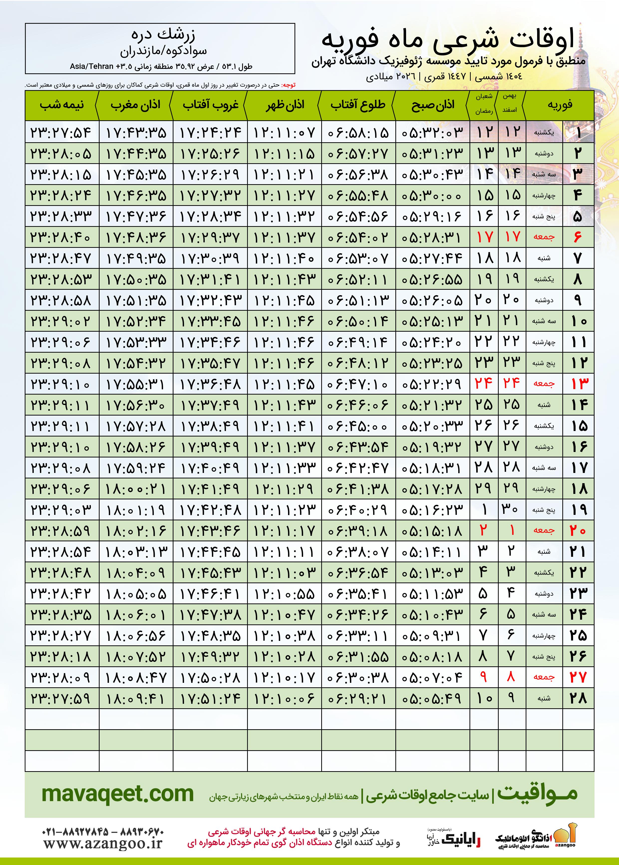 جهت نمایش تصویر جدول اوقات شرعی ماه رمضان ٠٤ - ١٤٠٤ شمسی | ٢٠٢٦ میلادی | ١٤٤٧ قمری شهر زرشک دره در