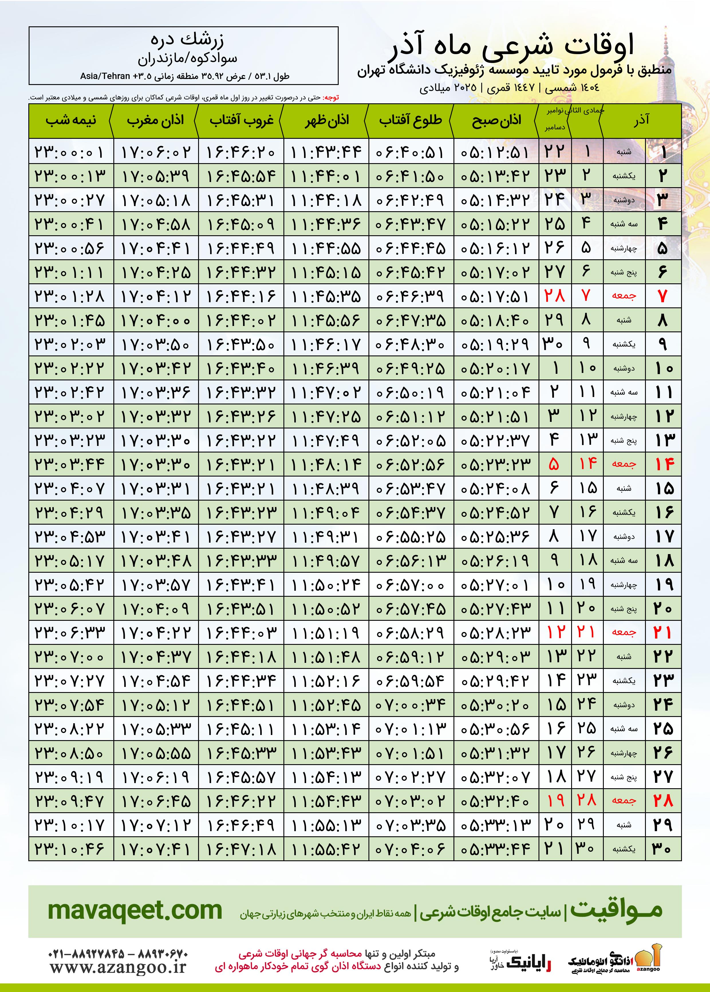 اوقات شرعی آذر ١٤٠٤ شمسی شهر زرشک دره