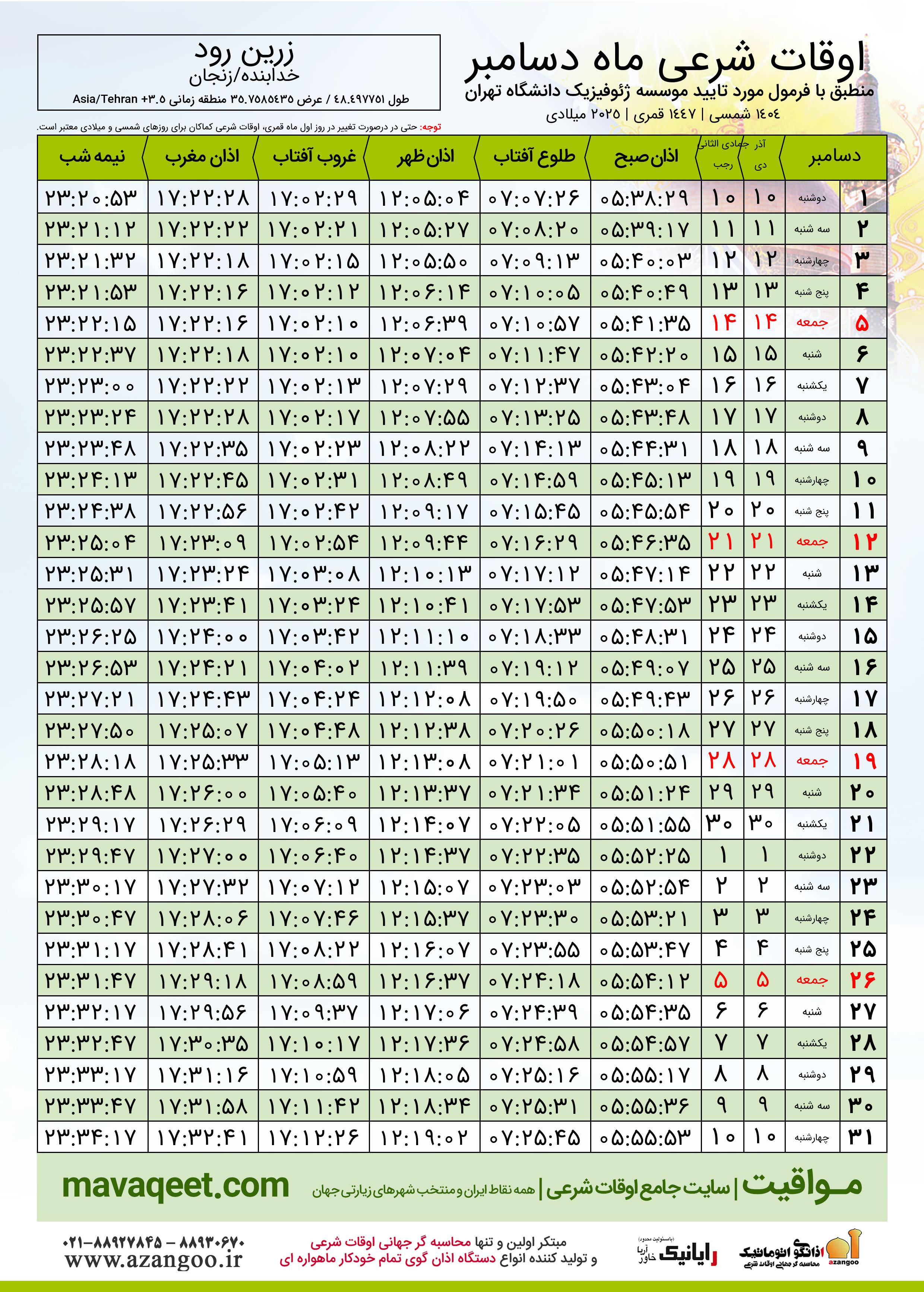 جدول اوقات شرعی دسامبر ٢٠٢٥ میلادی شهر زرین رود