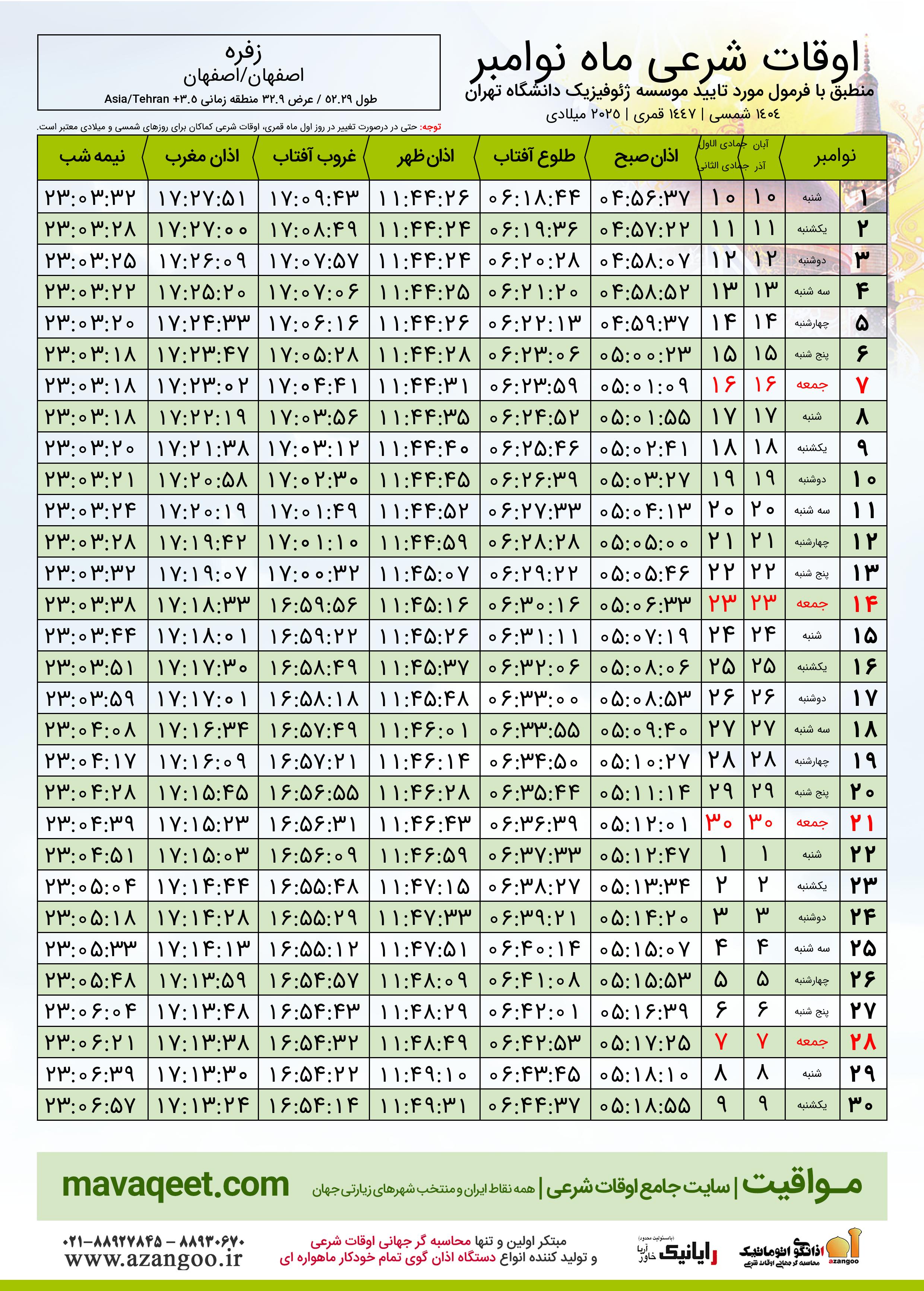 جدول اوقات شرعی آبان ١٤٠٤ شمسی شهر زفره