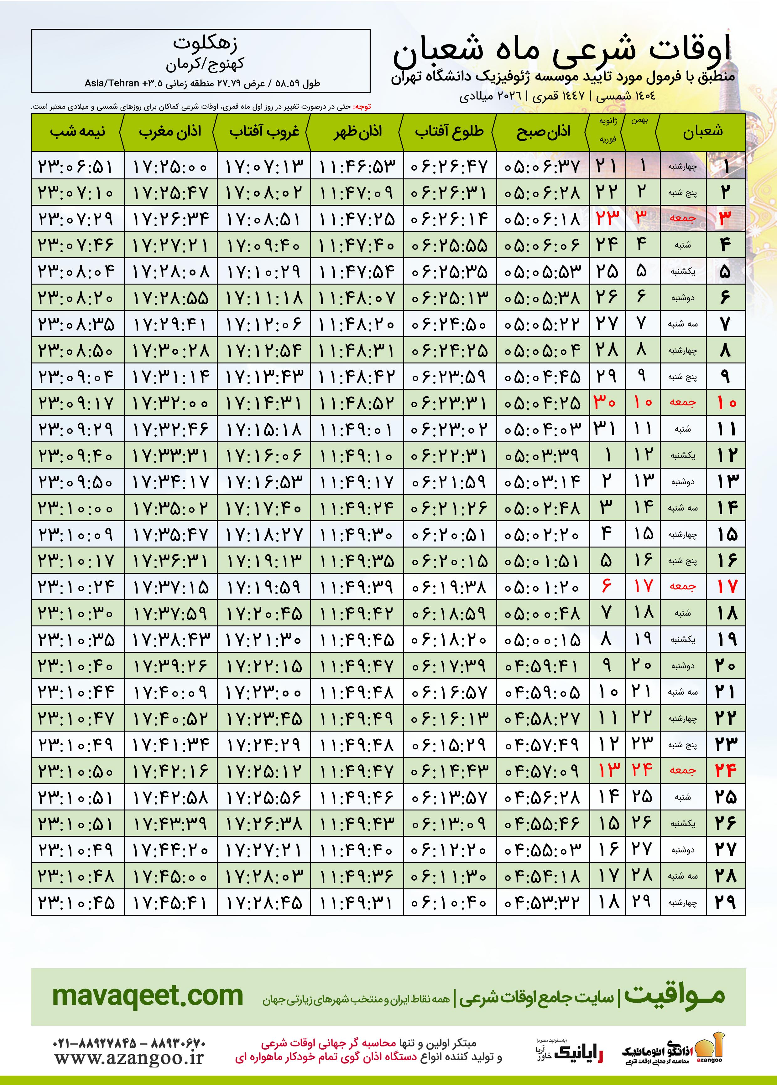 اوقات شرعی ماه شعبان ١٤٤٧ هـ.ق شهر زهکلوت بر