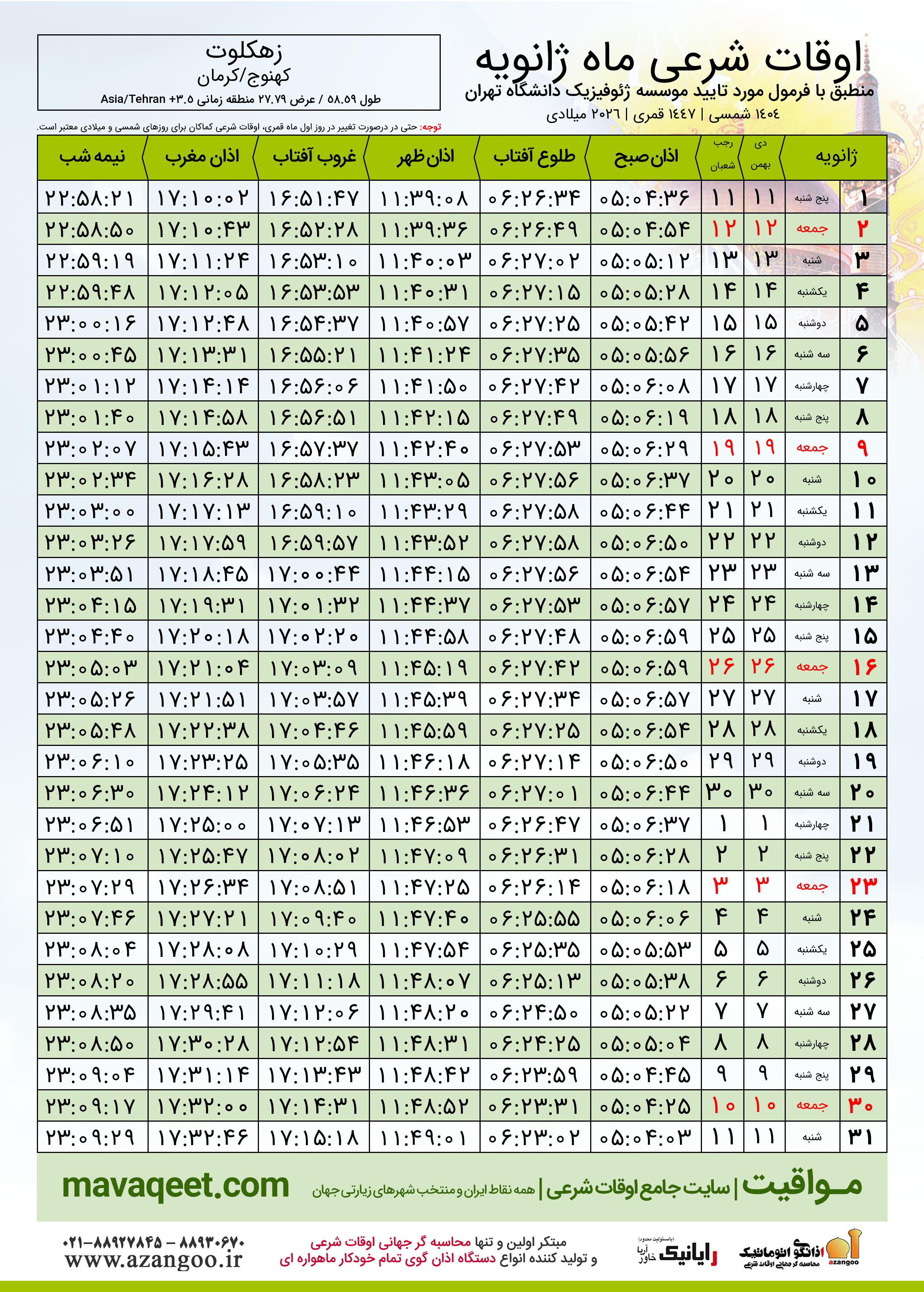 اوقات شرعی رجب ١٤٤٧ قمری شهر زهکلوت