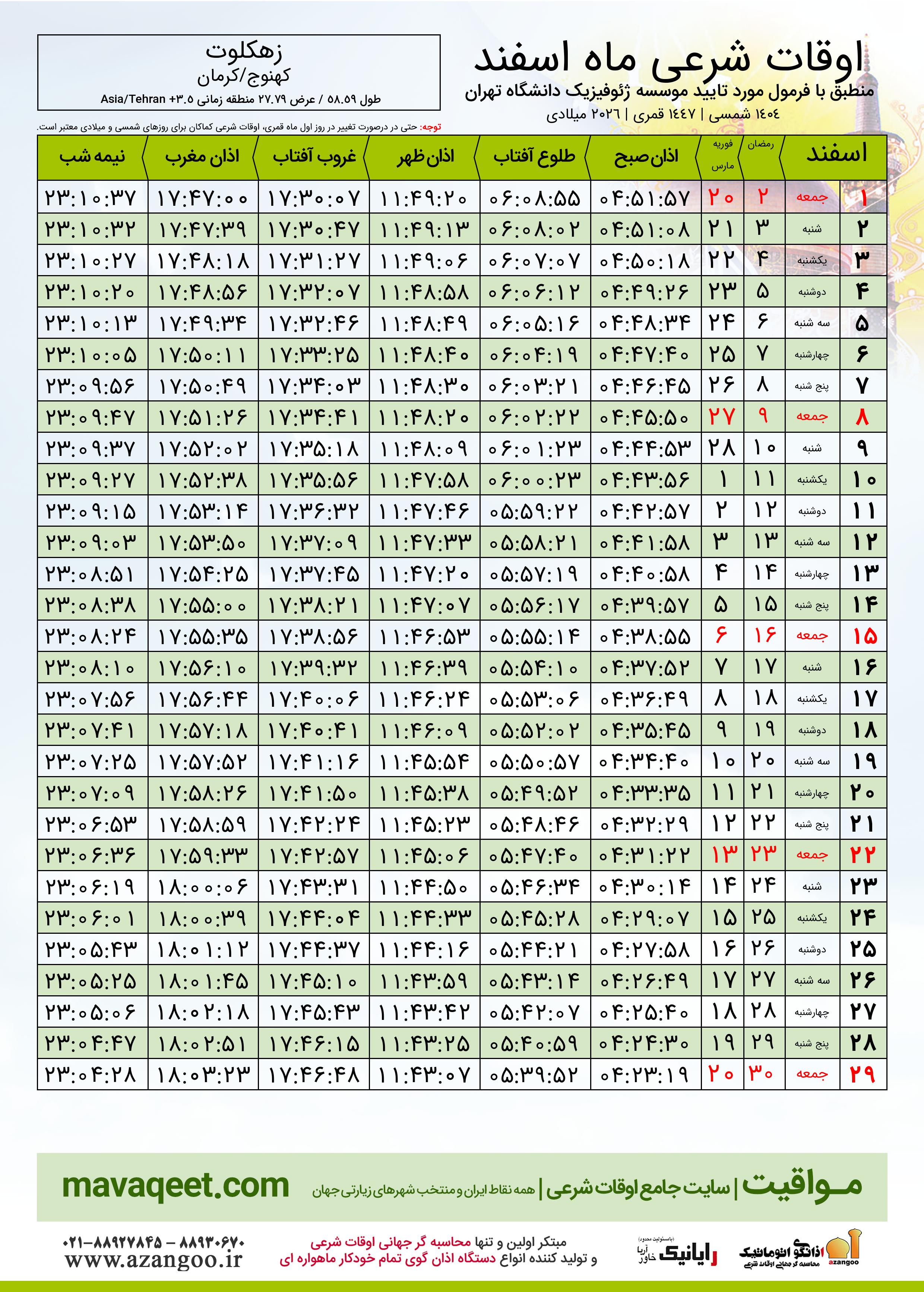 دانلود اوقات شرعی اسفند ٠٤ - ١٤٠٤ شهر زهکلوت