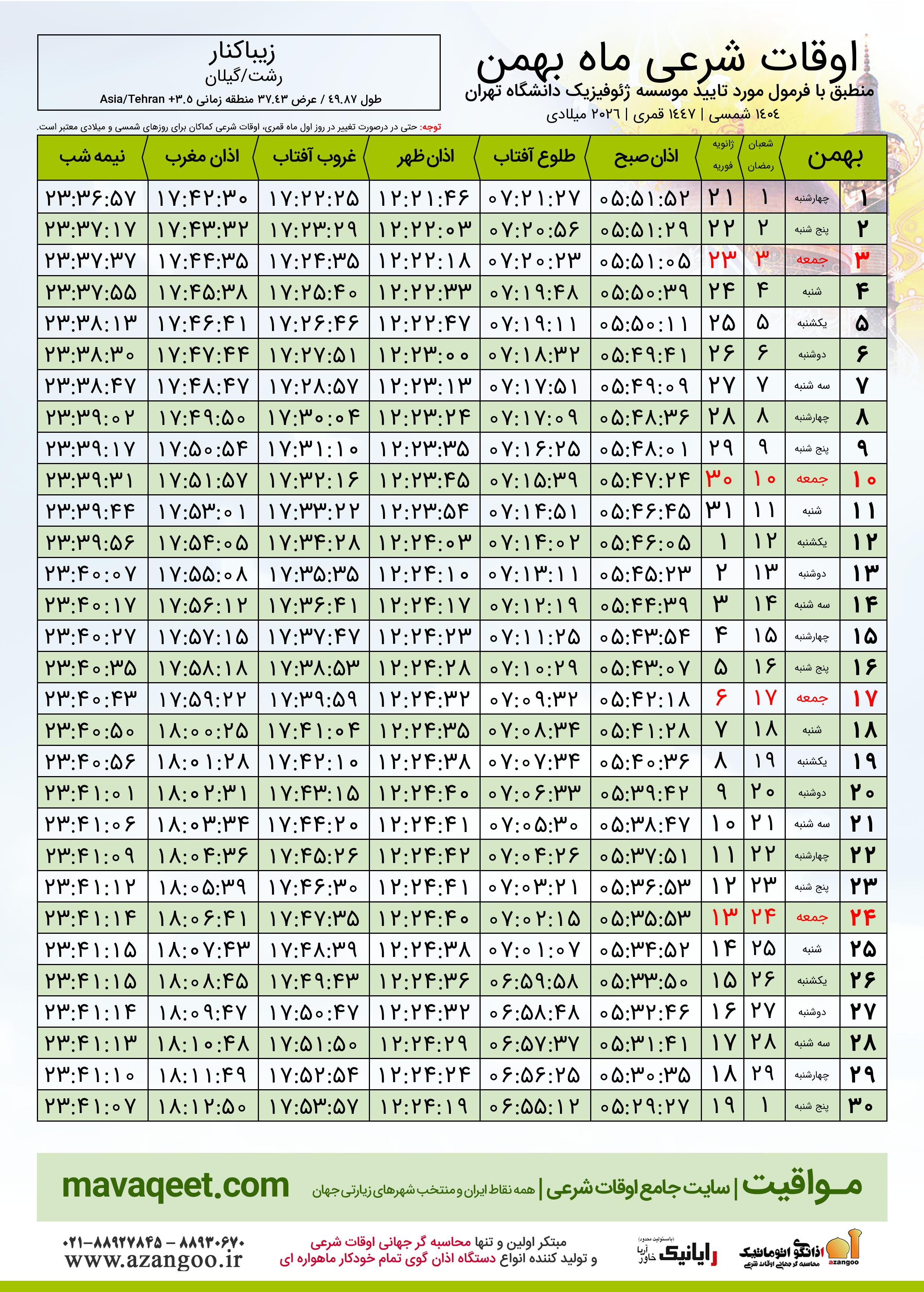 اوقات شرعی بهمن ١٤٠٤ شمسی شهر زیباکنار