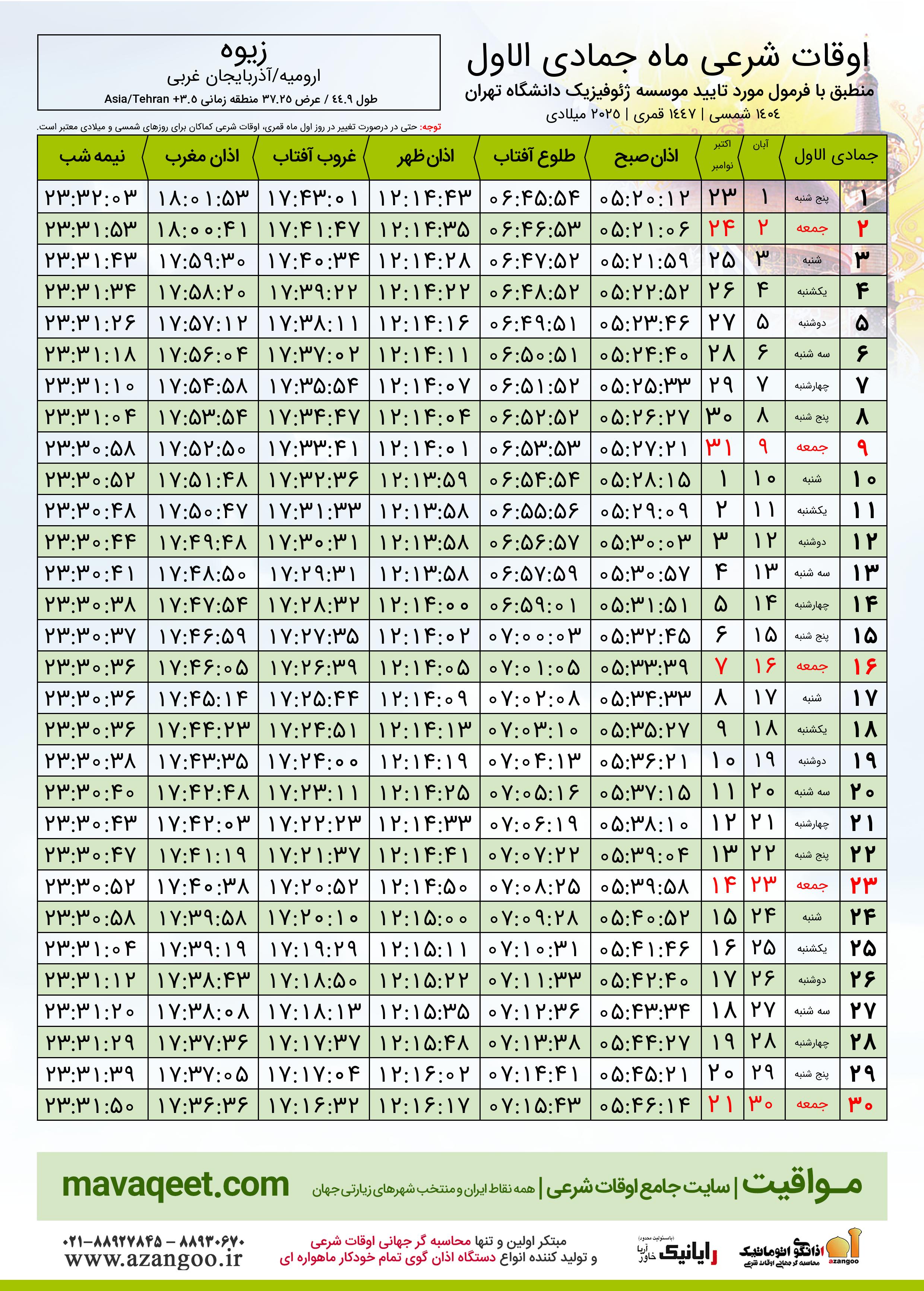 جدول اوقات شرعی جمادی الاول ١٤٤٧ قمری شهر زیوه