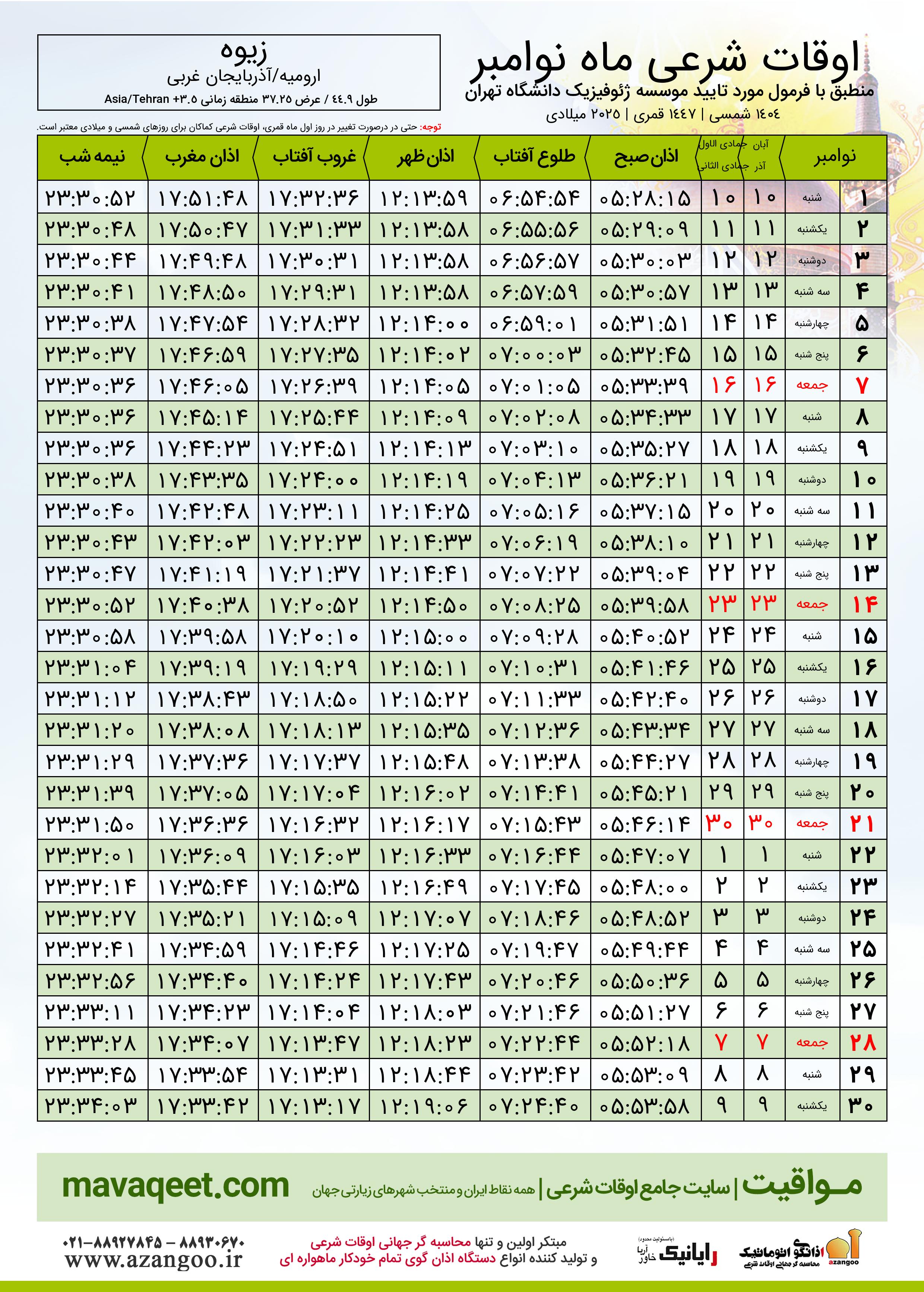 جدول اوقات شرعی نوامبر ٢٠٢٥ میلادی شهر زیوه