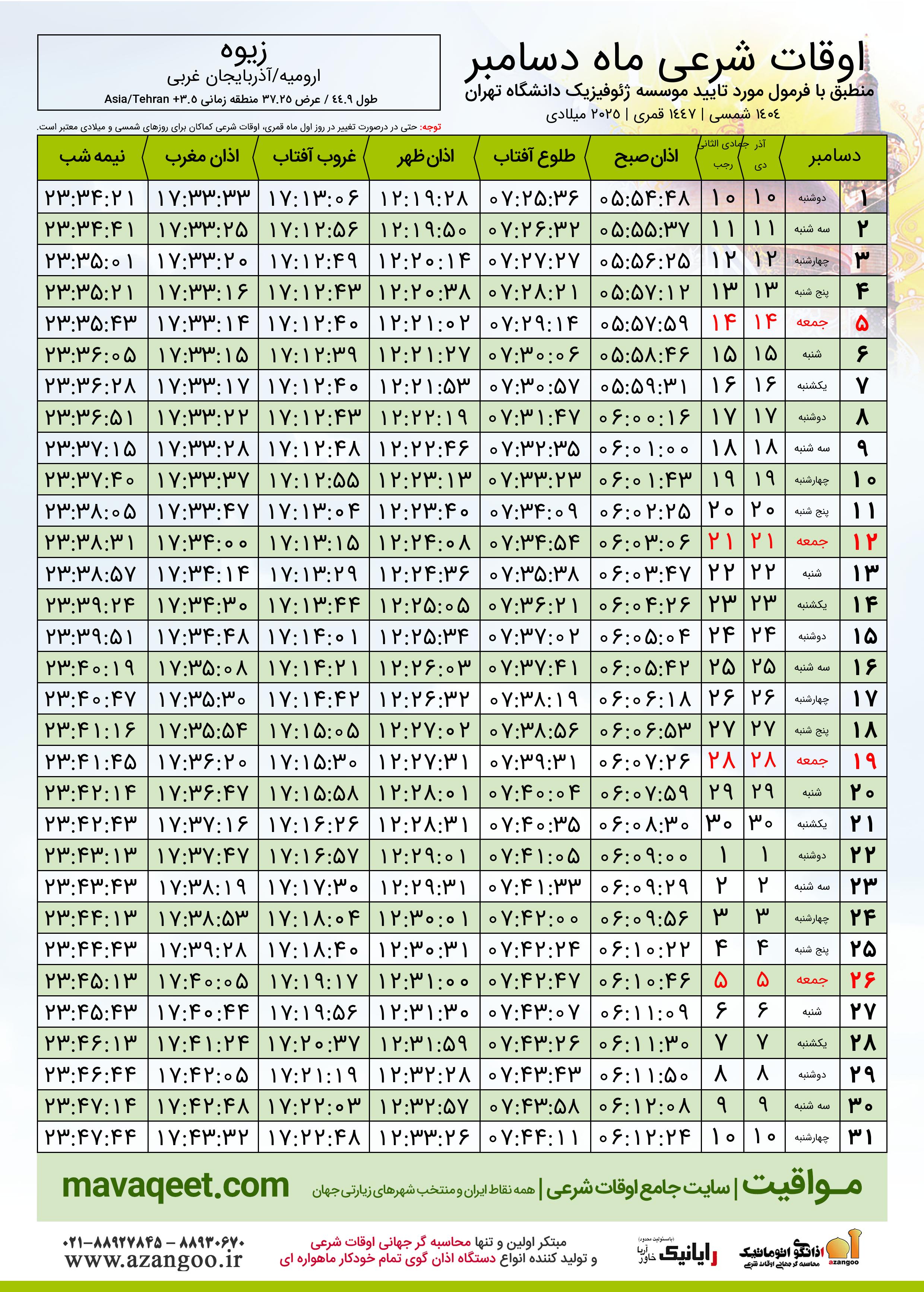 اوقات شرعی دسامبر ٢٠٢٥ میلادی شهر زیوه