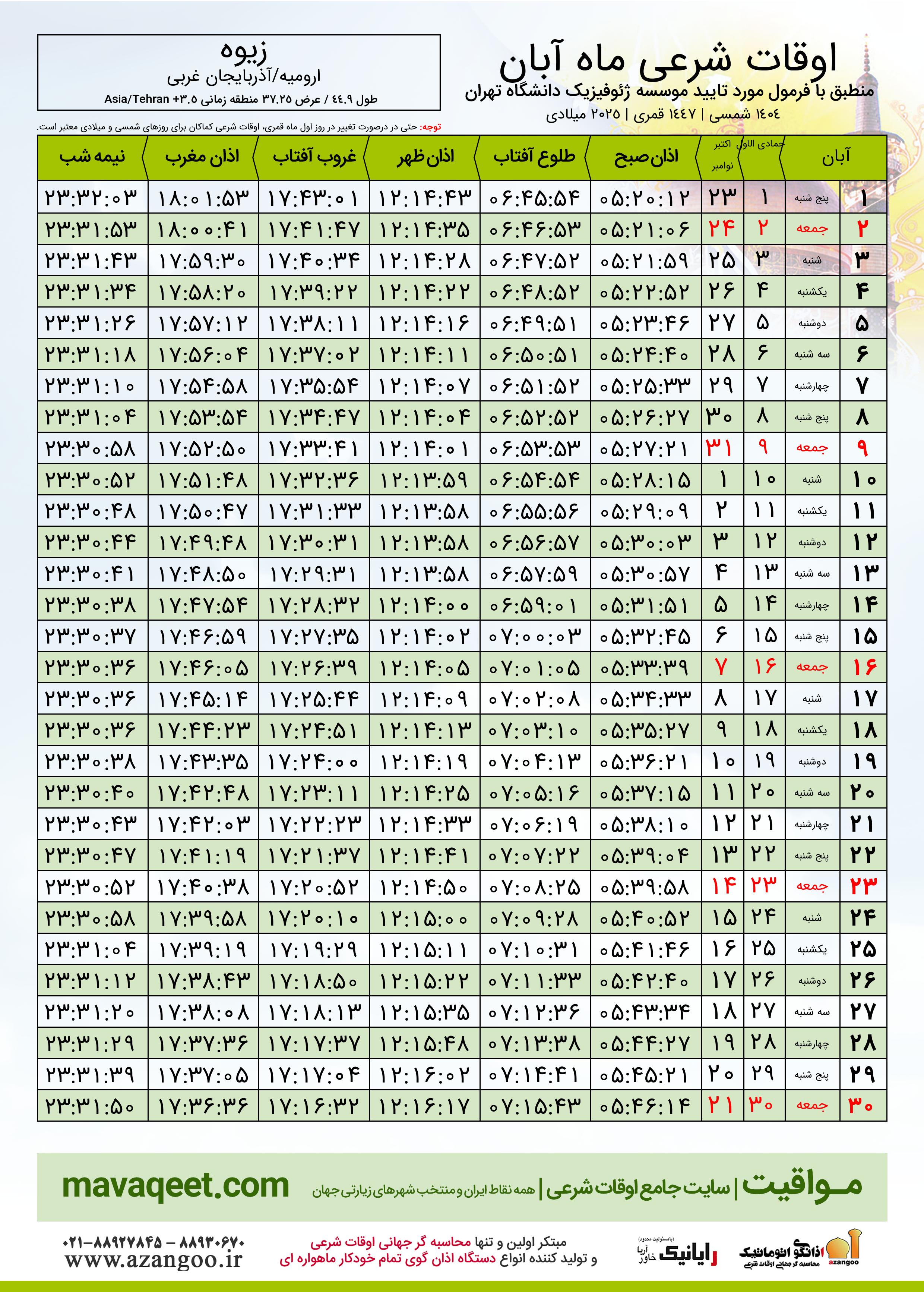 جدول اوقات شرعی آبان ١٤٠٤ شمسی شهر زیوه