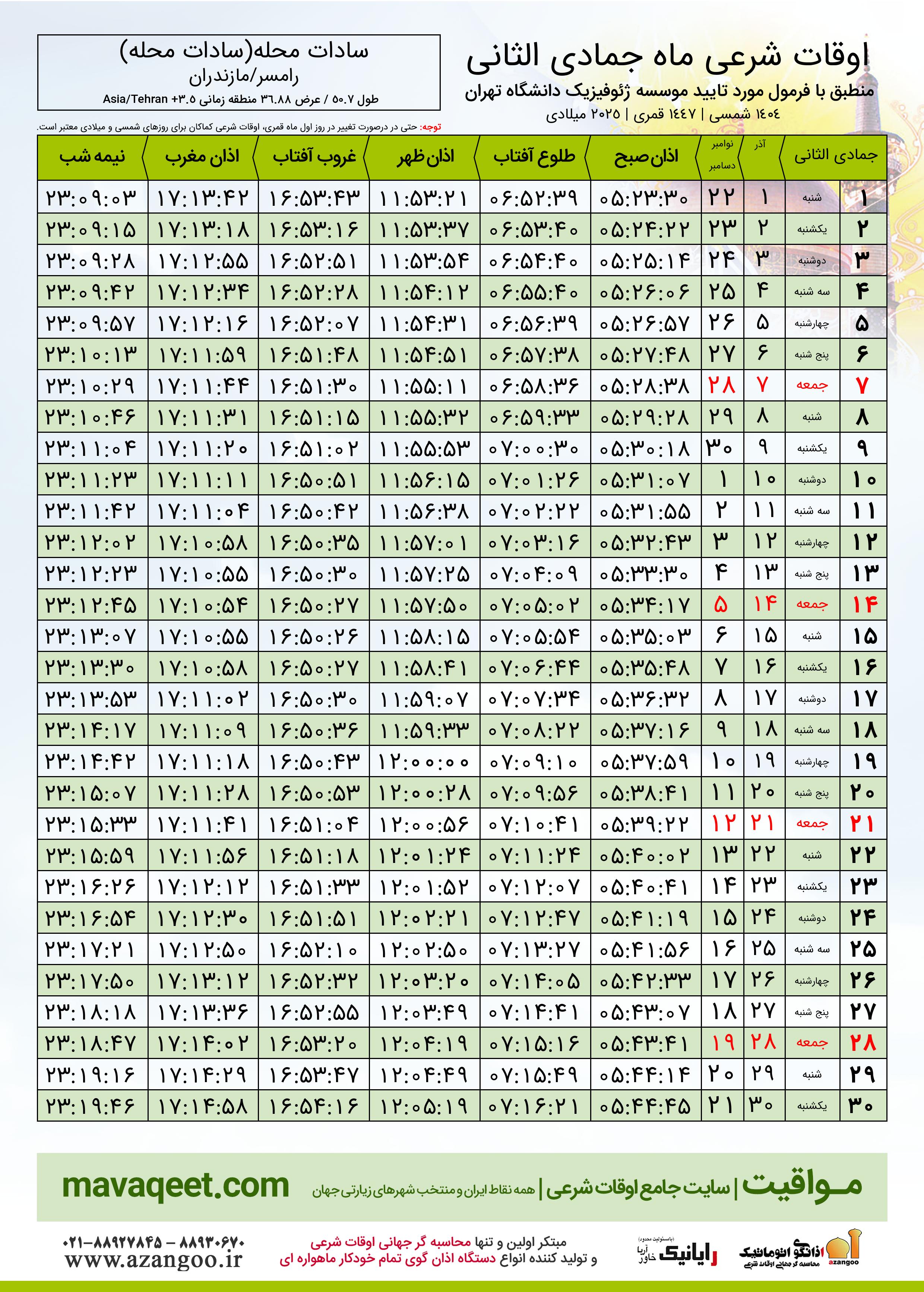 جدول اوقات شرعی جمادی الثانی ١٤٤٧ قمری شهر سادات محله(سادات محله)