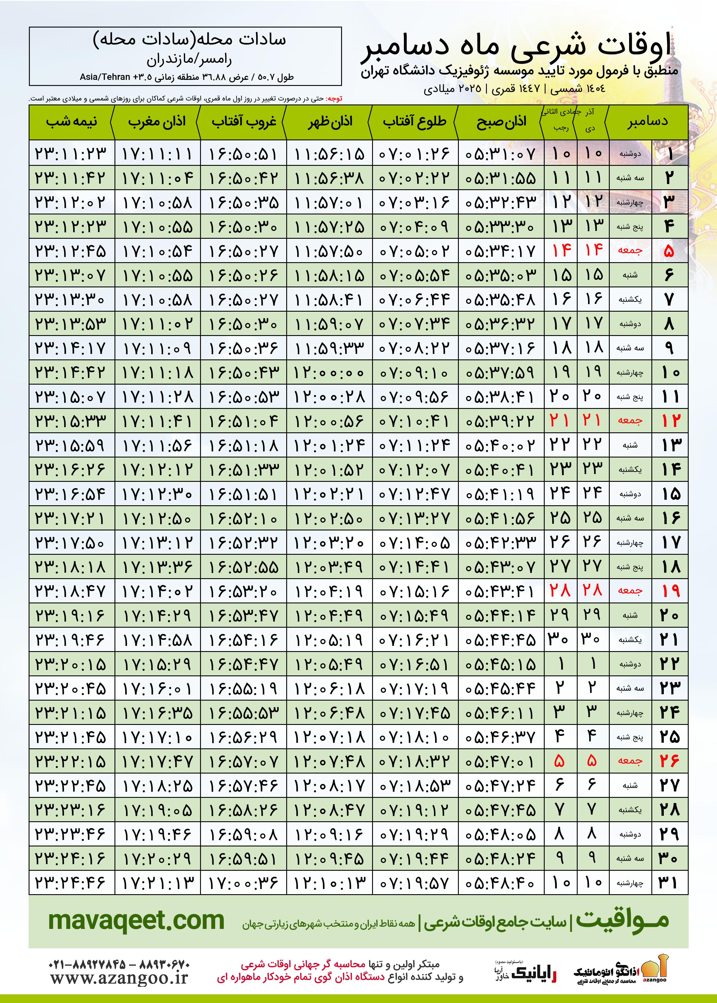 جدول اوقات شرعی دسامبر ٢٠٢٥ میلادی شهر سادات محله(سادات محله)