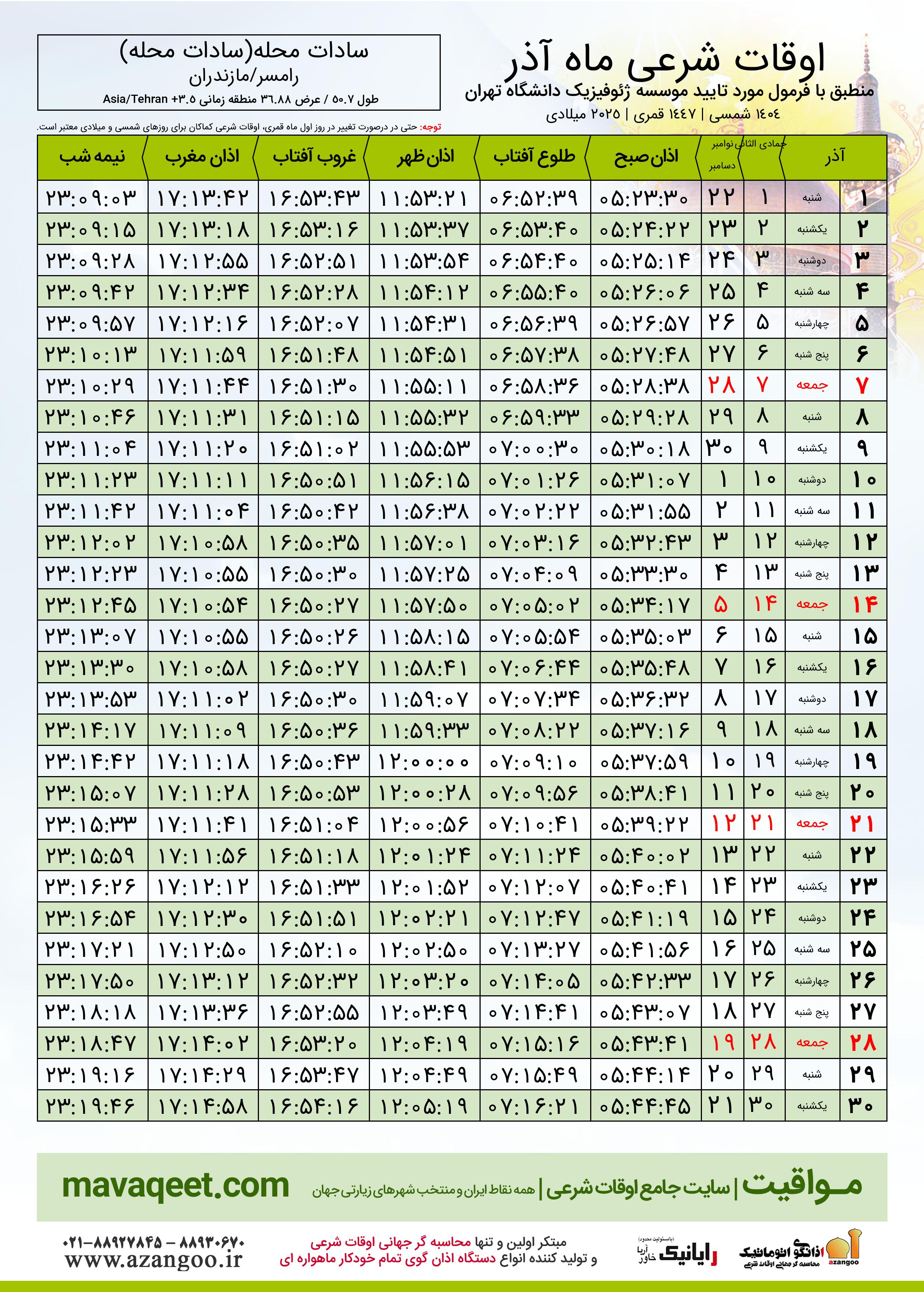 جدول اوقات شرعی آذر ١٤٠٤ شمسی شهر سادات محله(سادات محله)