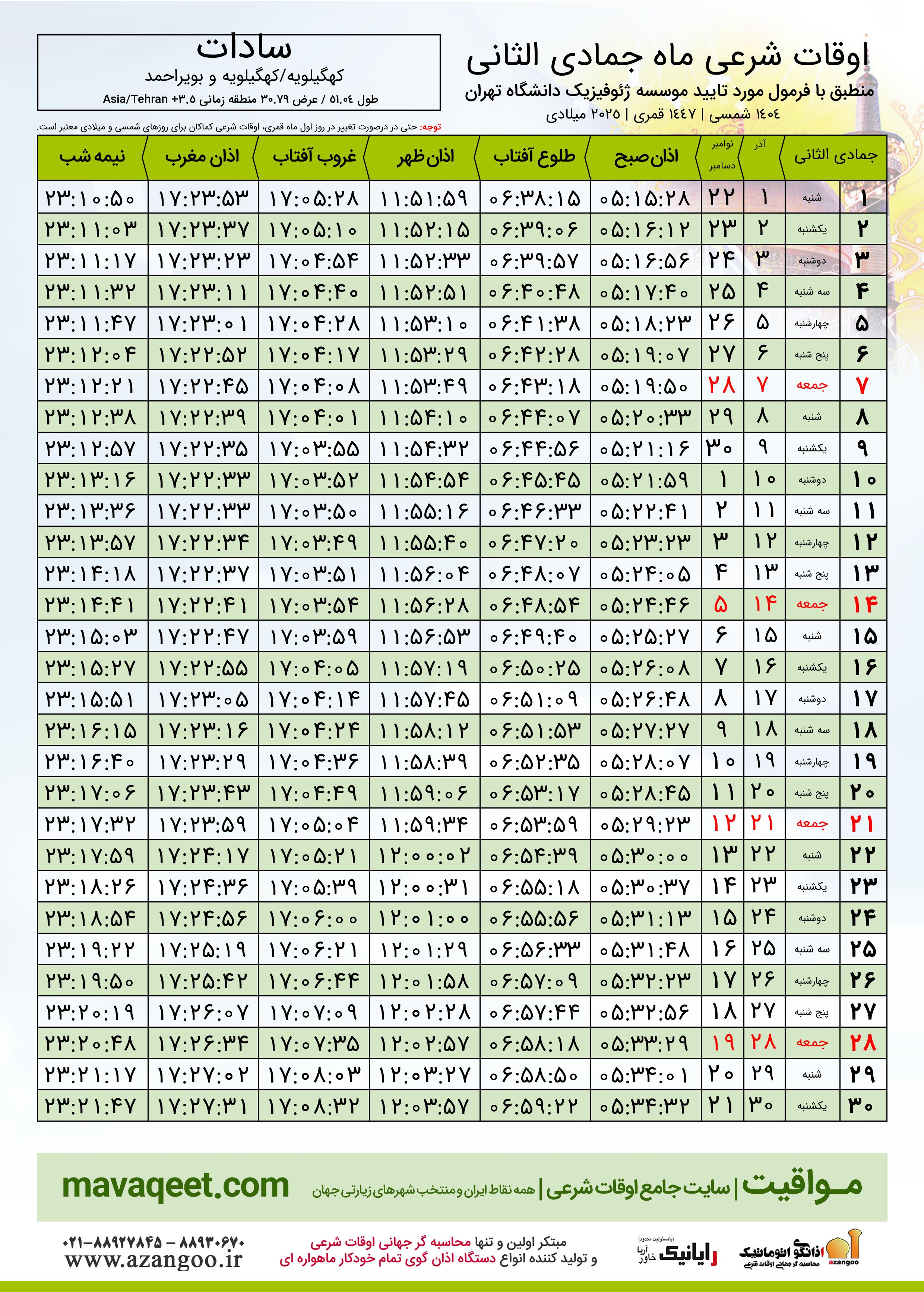 جدول اوقات شرعی جمادی الثانی ١٤٤٧ قمری شهر سادات