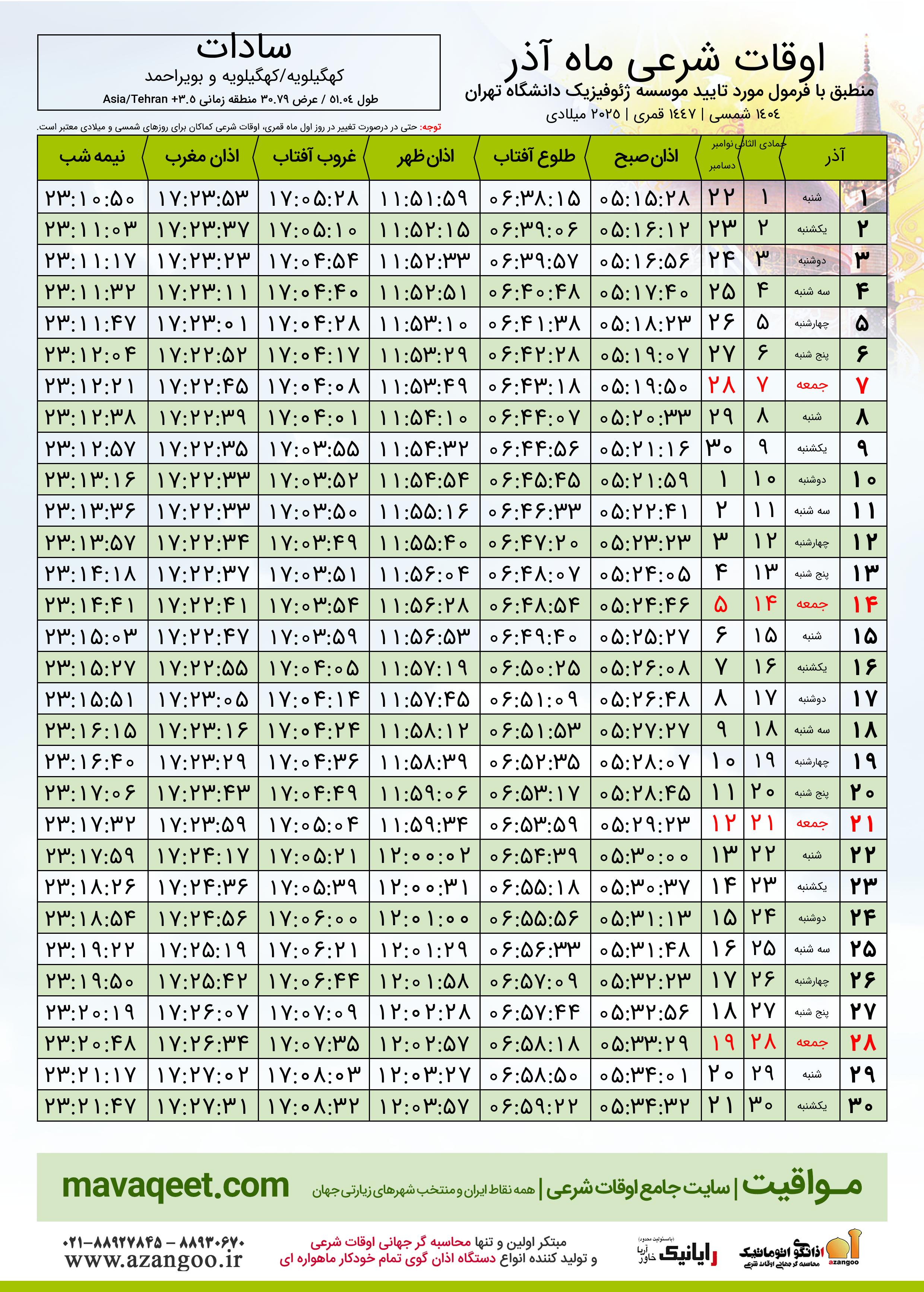 جدول اوقات شرعی آذر ١٤٠٤ شمسی شهر سادات