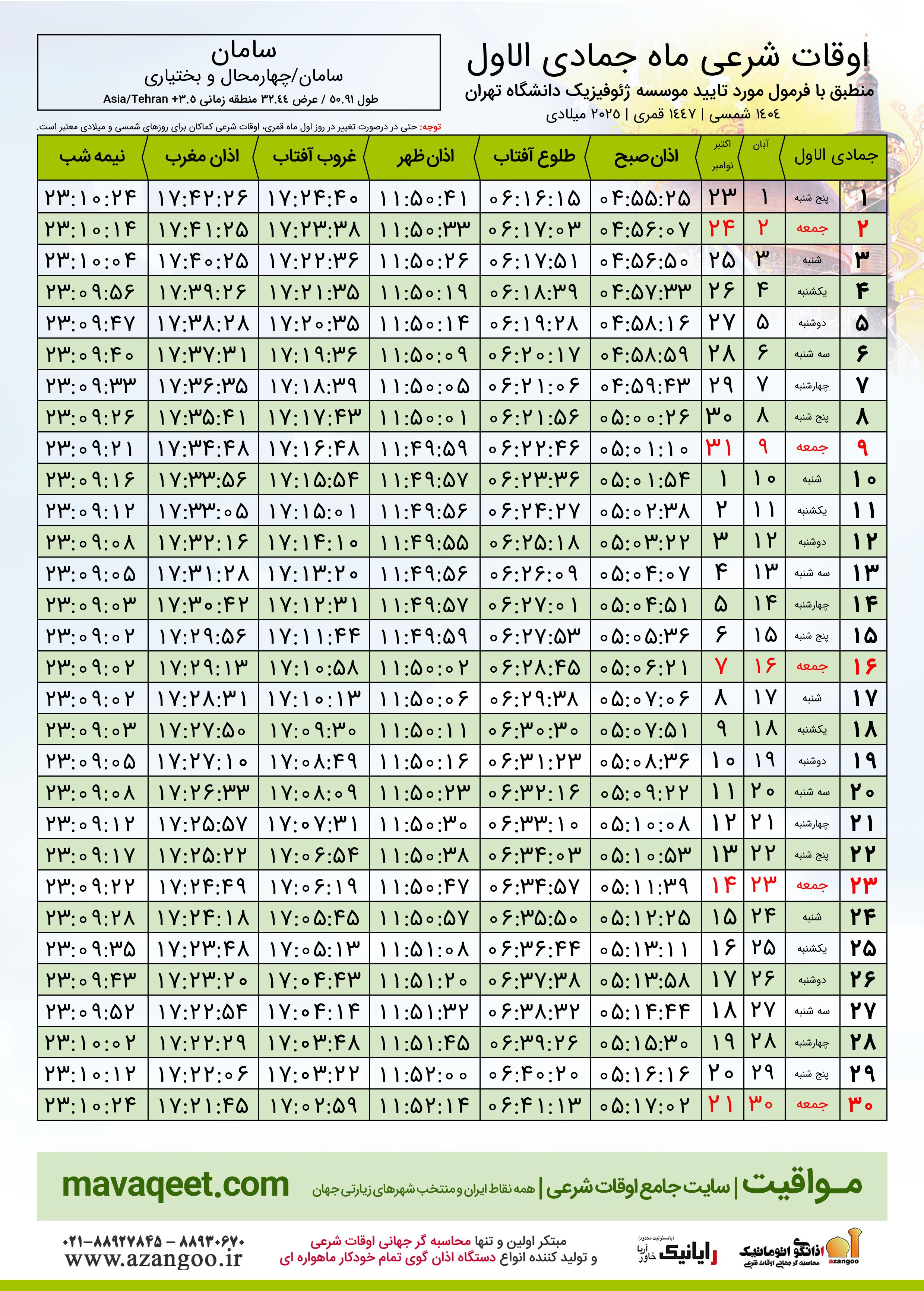 جدول اوقات شرعی جمادی الاول ١٤٤٧ قمری شهر سامان