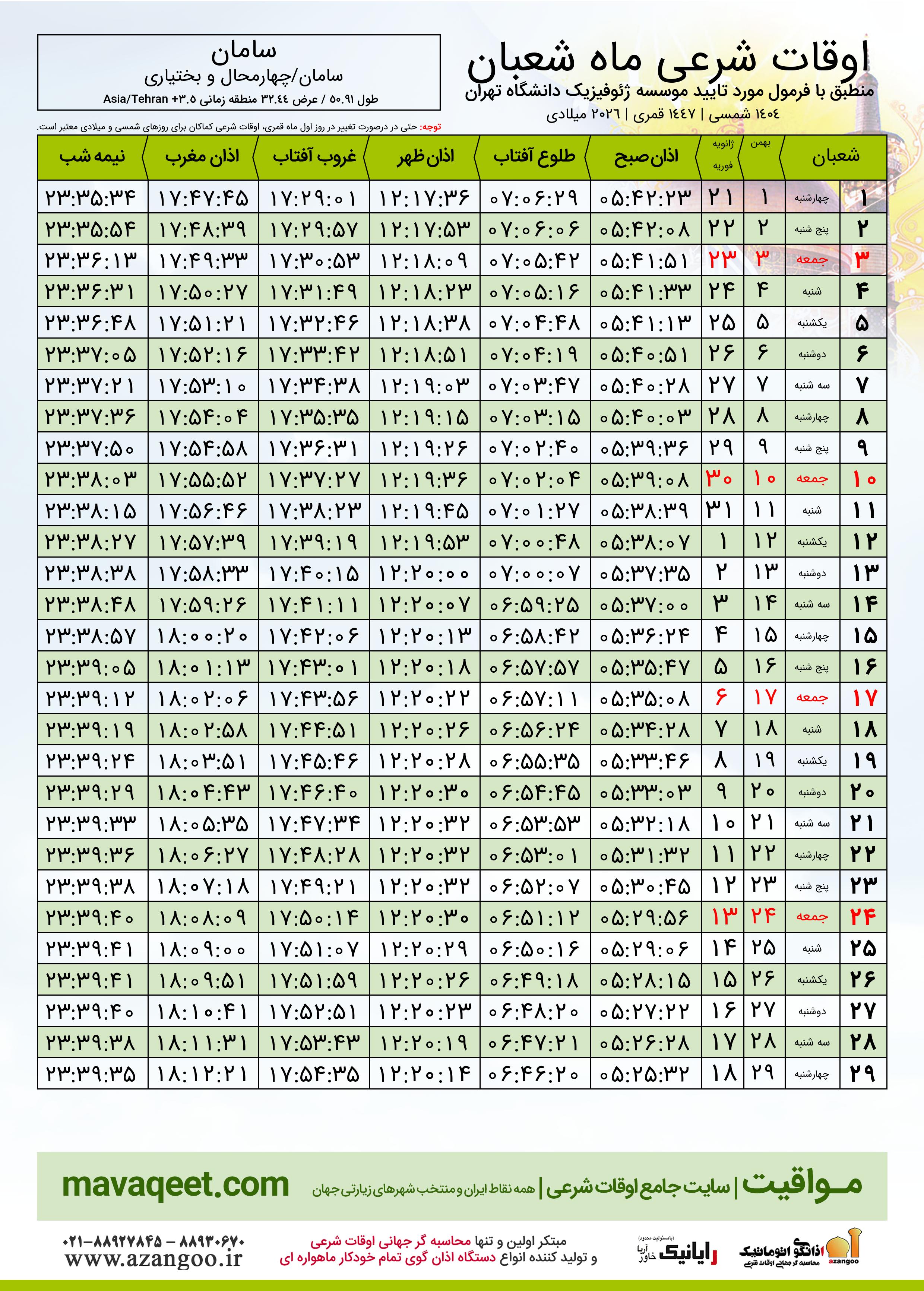 اوقات شرعی شعبان ١٤٤٧ شهر سامان + دانلود