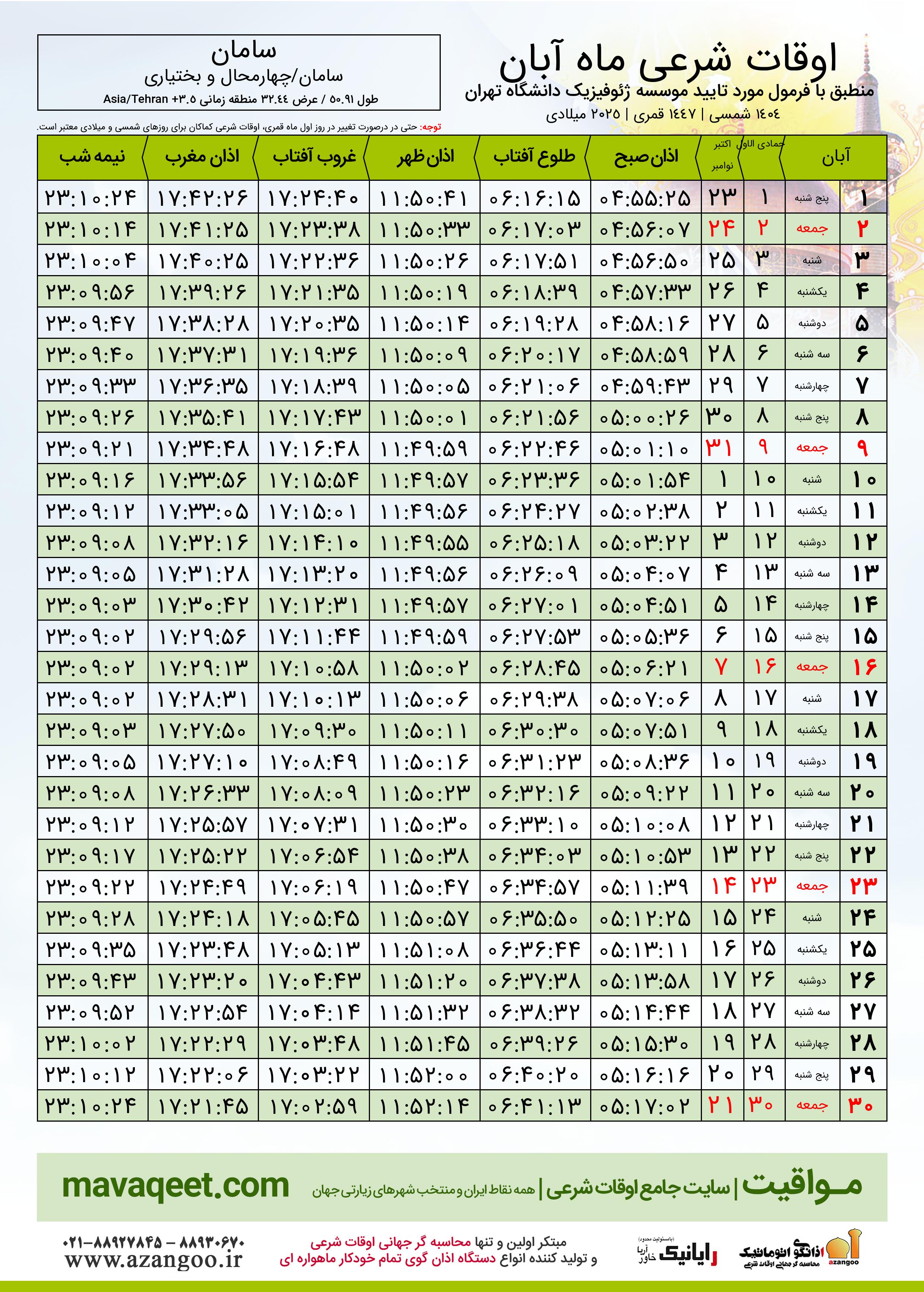 جدول اوقات شرعی آبان ١٤٠٤ شمسی شهر سامان