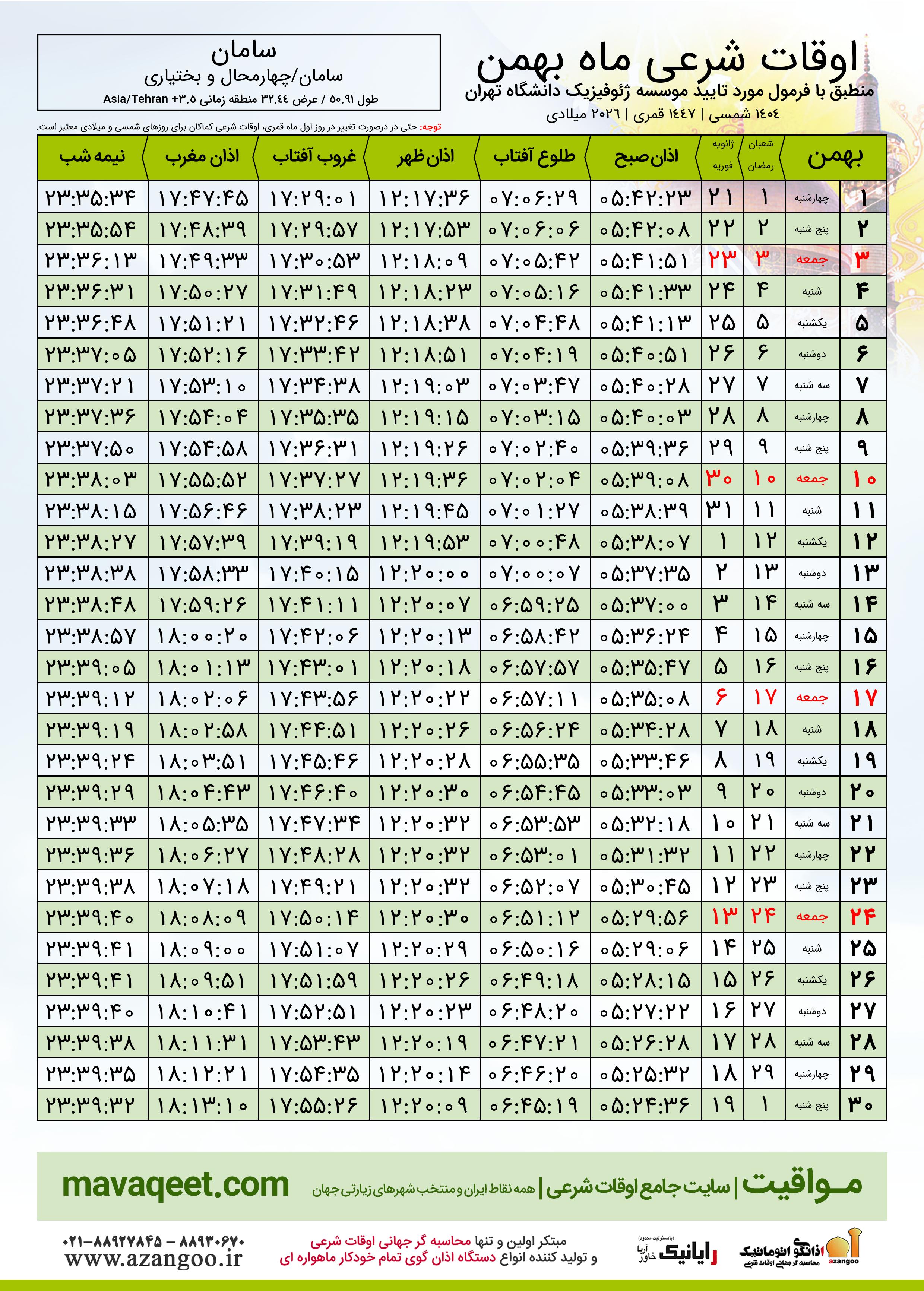 دانلود اوقات شرعی بهمن ٠٤ - ١٤٠٤ شهر سامان