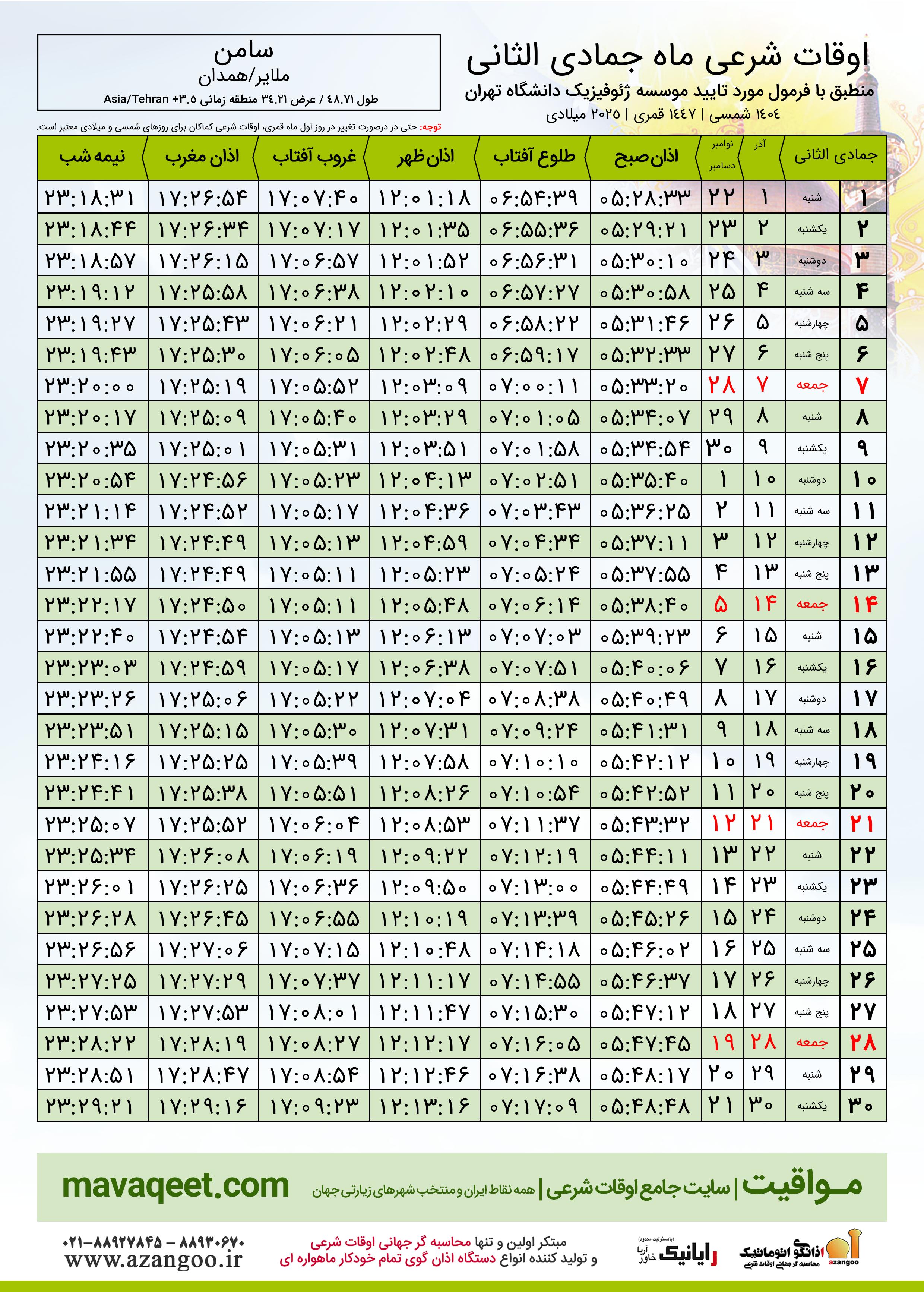 اوقات شرعی ماه جمادی الثانی ١٤٤٧ هـ.ق شهر سامن بر