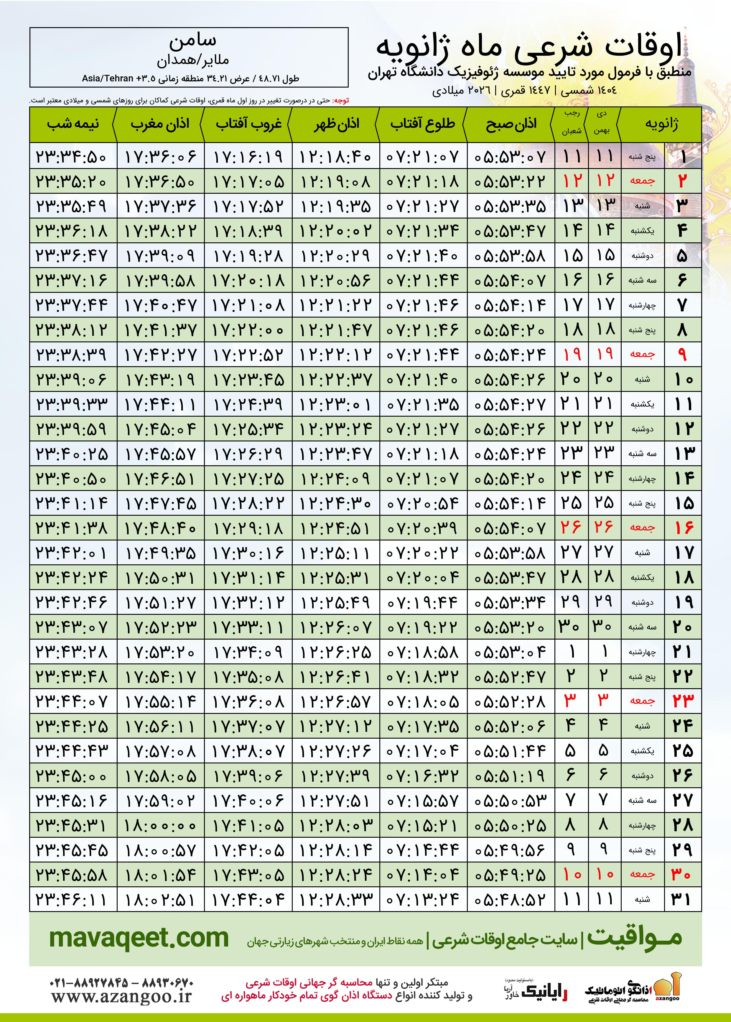 اوقات شرعی ماه رجب ١٤٤٧ هـ.ق شهر سامن بر
