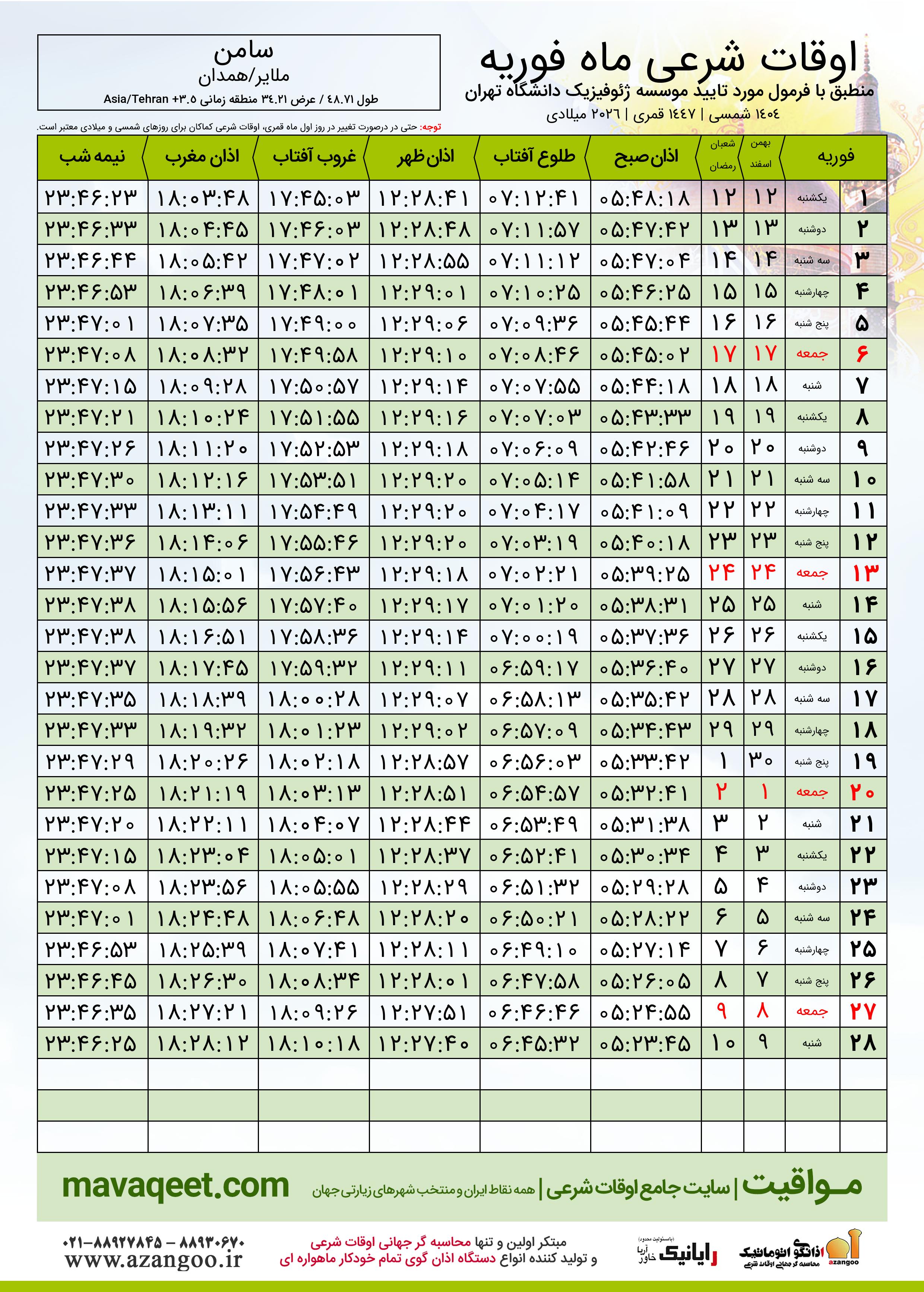 اوقات شرعی ماه شعبان ١٤٤٧ هـ.ق شهر سامن بر
