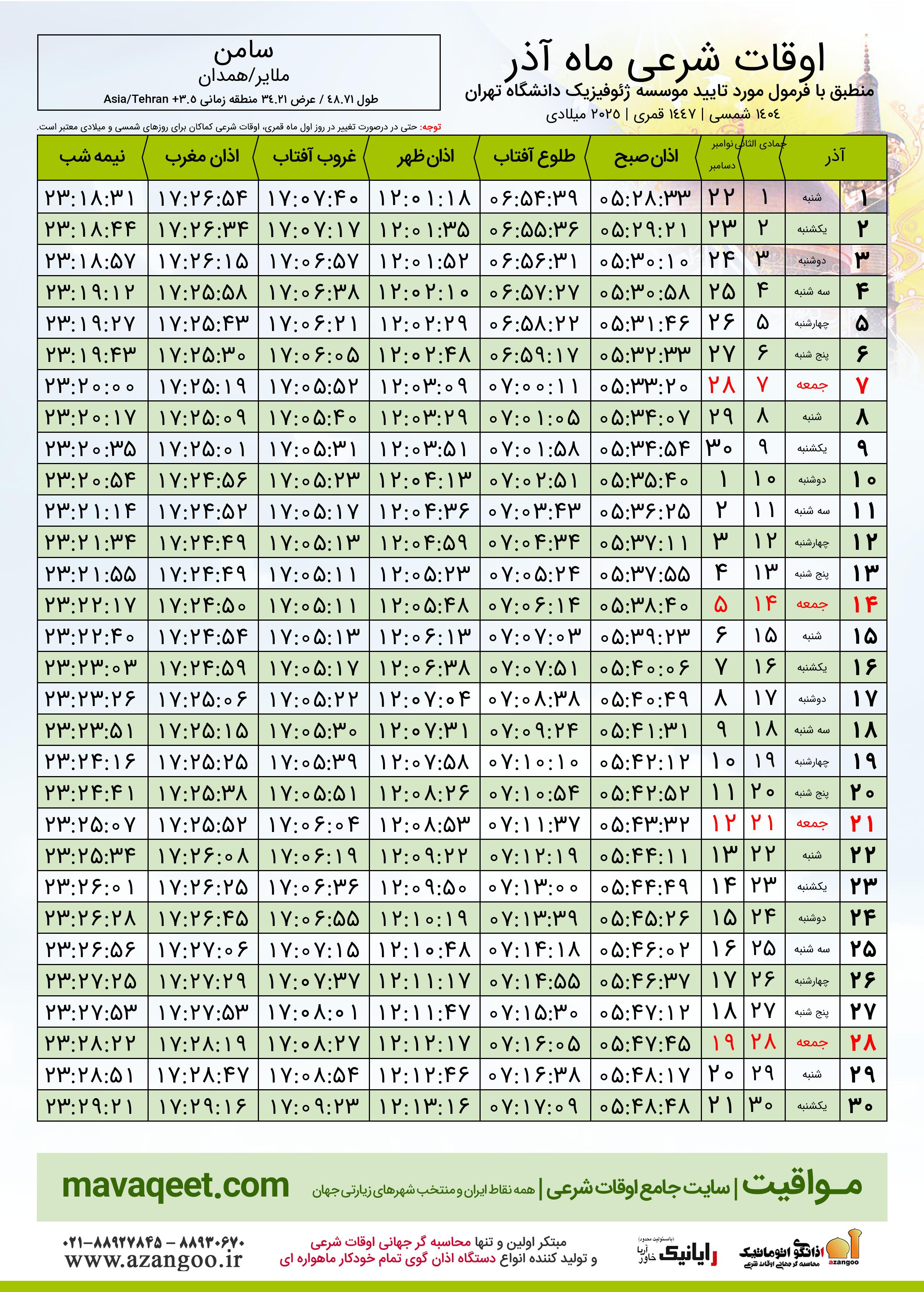 اوقات شرعی آذر ١٤٠٤ شمسی شهر سامن