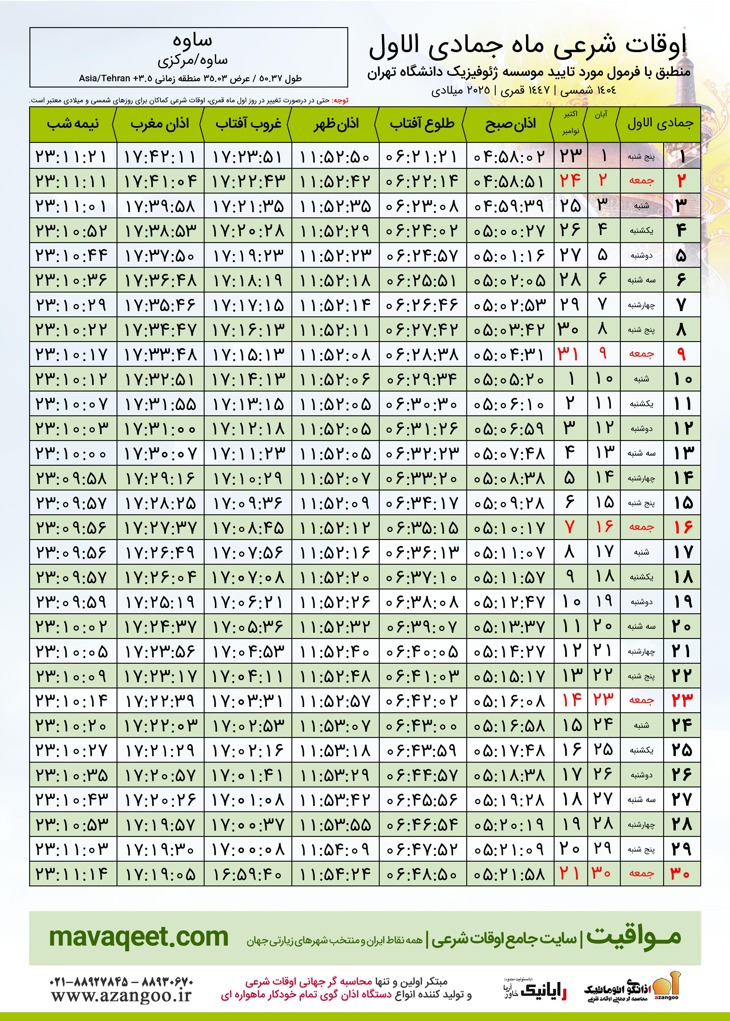 جدول اوقات شرعی جمادی الاول ١٤٤٧ قمری شهر ساوه
